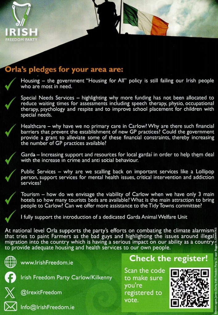 A leaflet from Orla Donohoe who is running for The Irish Freedom Party in Carlow in the 2024 Local Elections