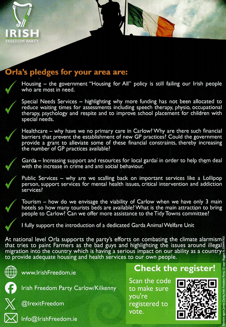 Leaflet from Orla Donohoe – Irish Freedom Party – Carlow – 2024 Local Elections » orladonohoeifple24b