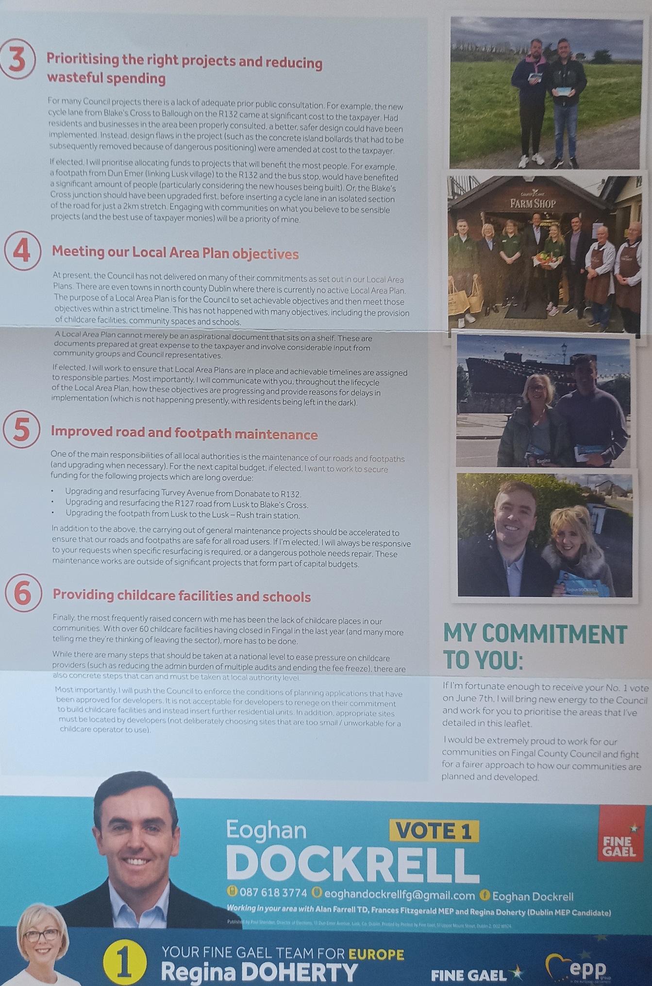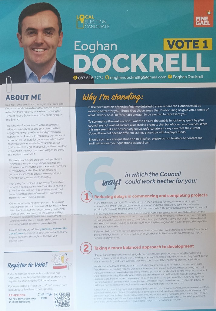 A leaflet from Eoghan Dockrell who is running for Fine Gael in Rush Lusk in the 2024 Local Elections