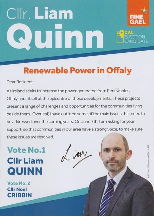 A Leaflet from Liam Quinn who is running for Fine Gael in Edenderry in the 2024 Local Elections