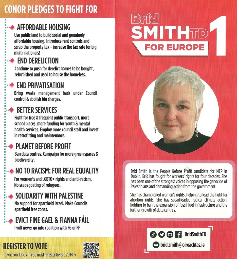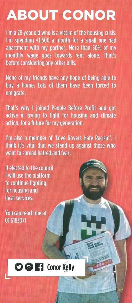 A leaflet form Conor Kelly who is running for People Before Profit in Rathfarnham Templeogue in the 2024 Local Elections
