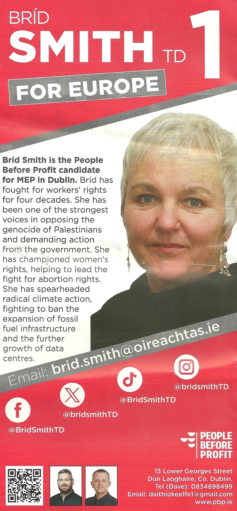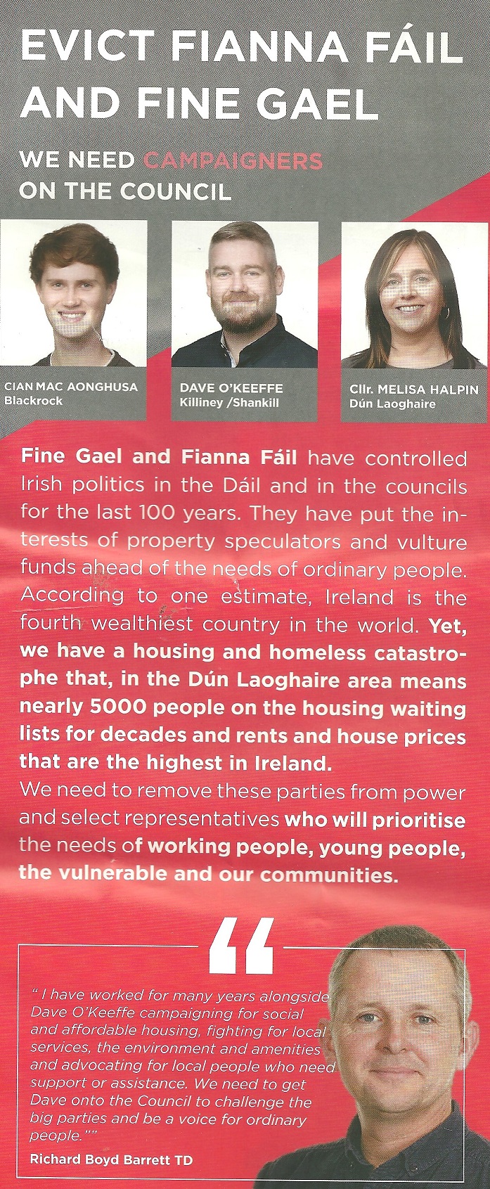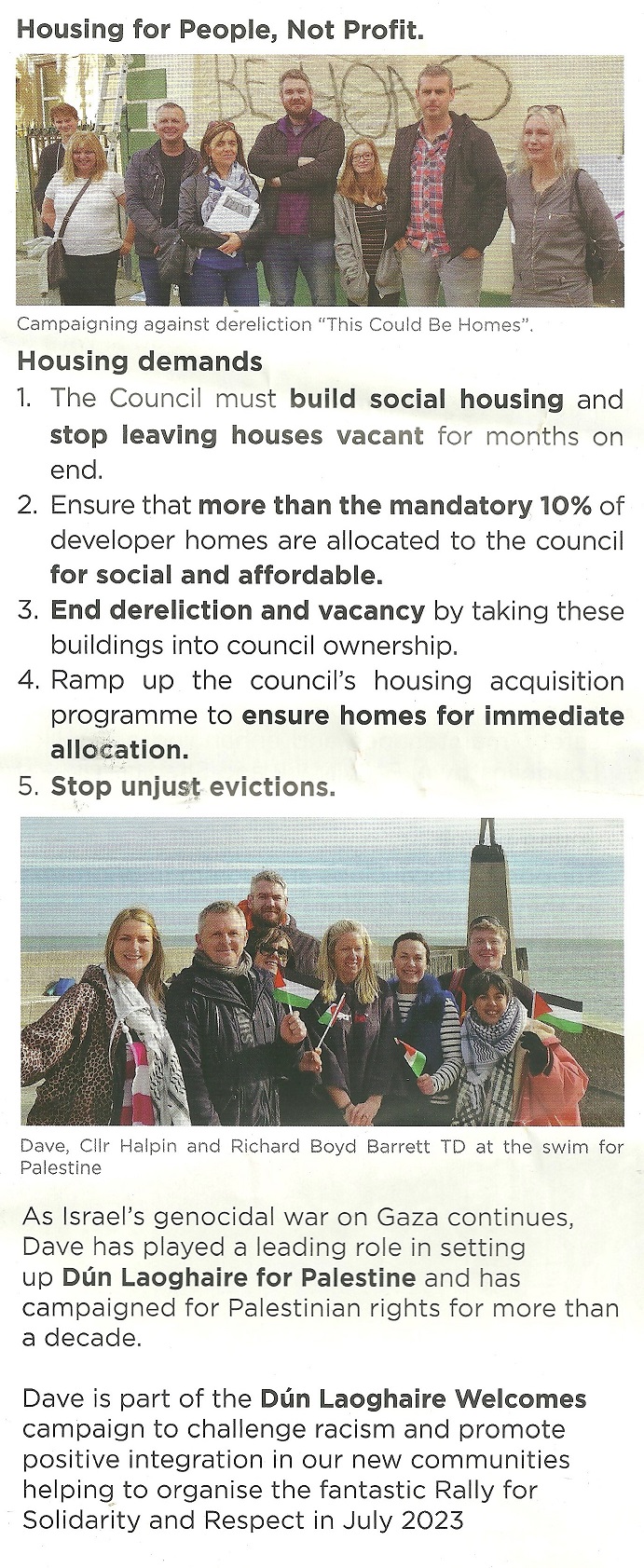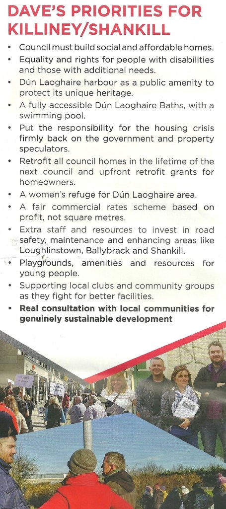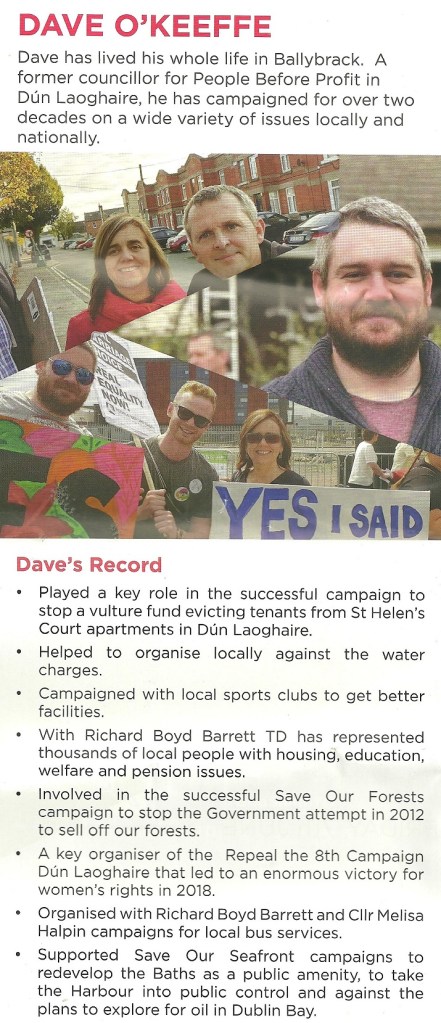 A leaflet from Dave O’Keefe who is running for People Before Profit in Killiney Shankill in the 2024 Local Elections