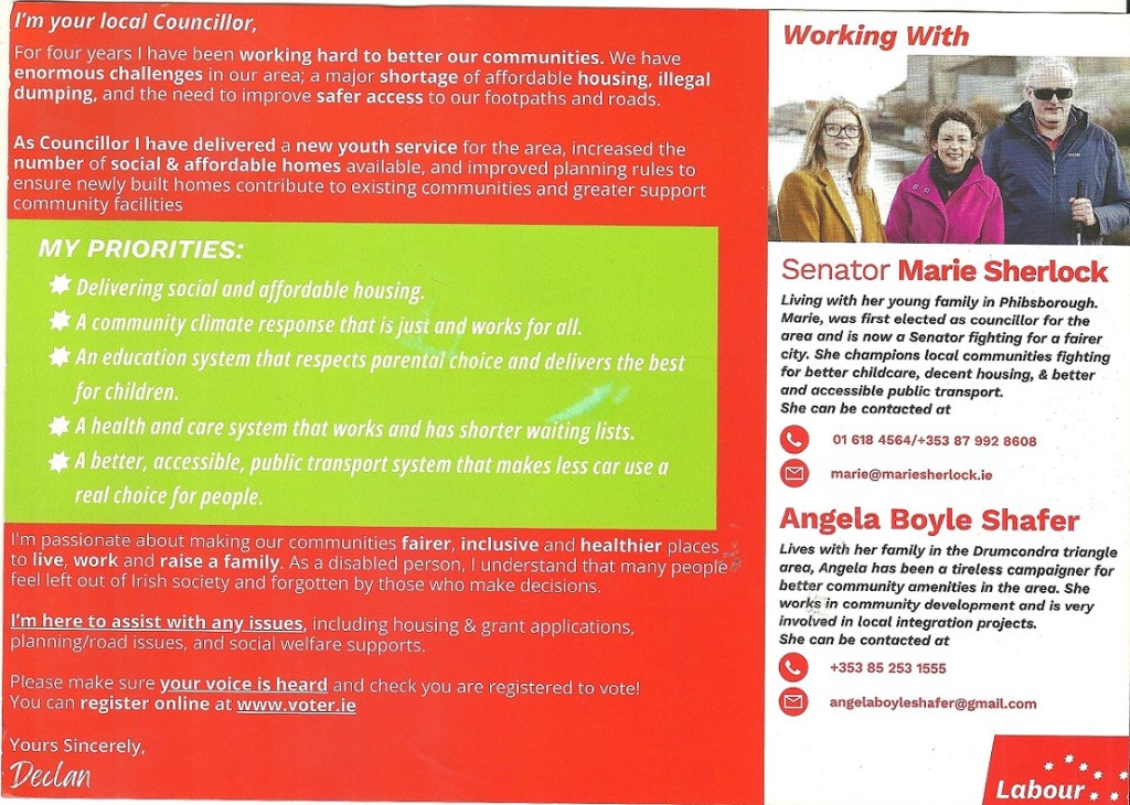 A leaflet from Declan Meenagh who is running for The Labour Party in Cabra Glasnevin in the 2024 Local Elections