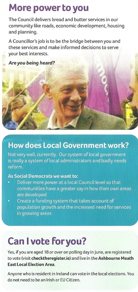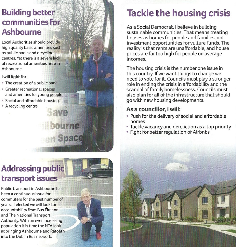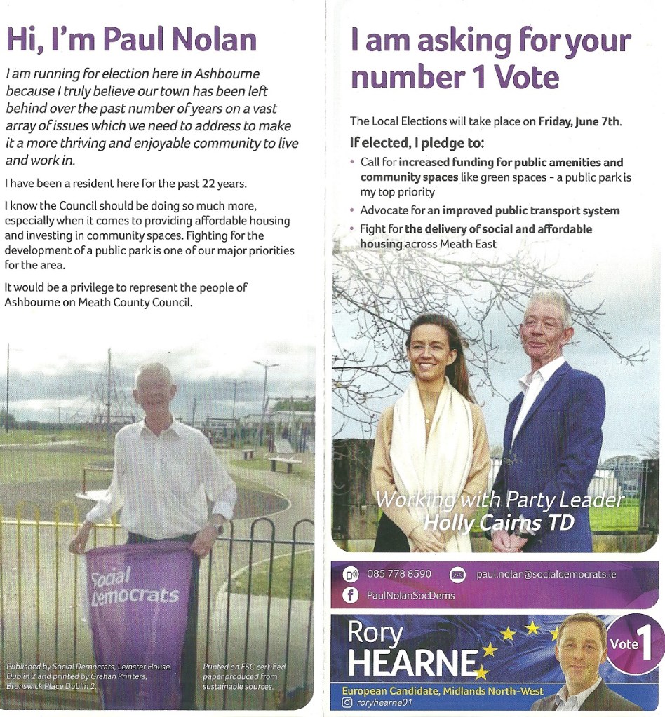 A leaflet from Paul Nolan who is running for The Social Democrats in Ashbourne in the 2024 Local Elections