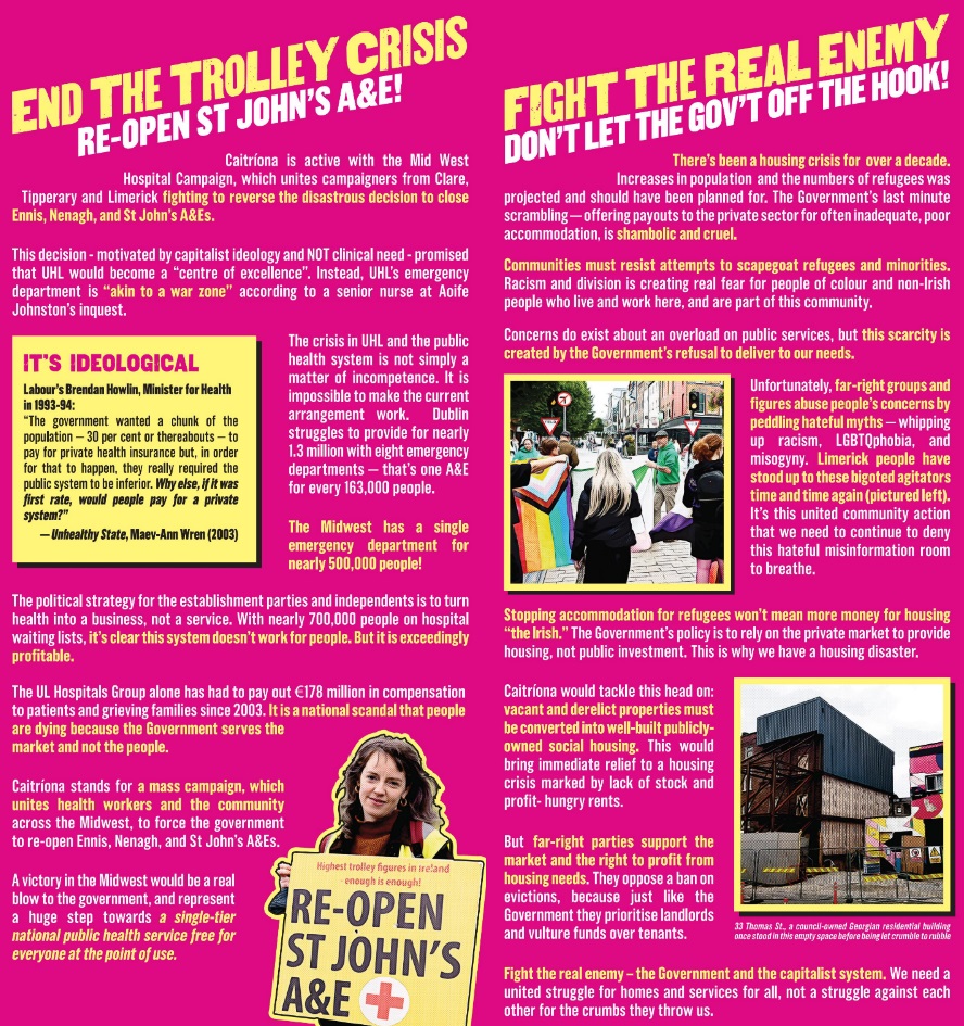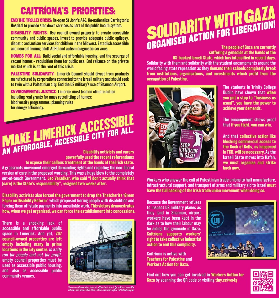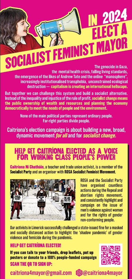 A leaflet from Caitríona Ní Chatháin who is running for The Socialist Party in the 2024 Limerick Mayoral Election. It’s available here too