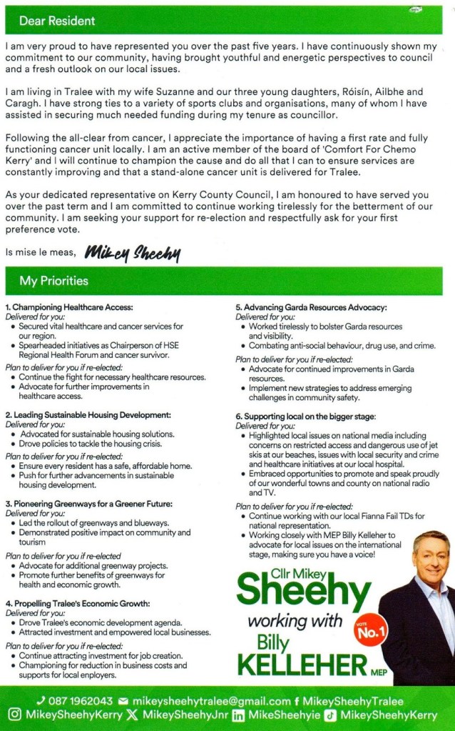 A leaflet from Mikey Sheehy who is running for Fianna Fáil in Tralee in the 2024 Local Elections