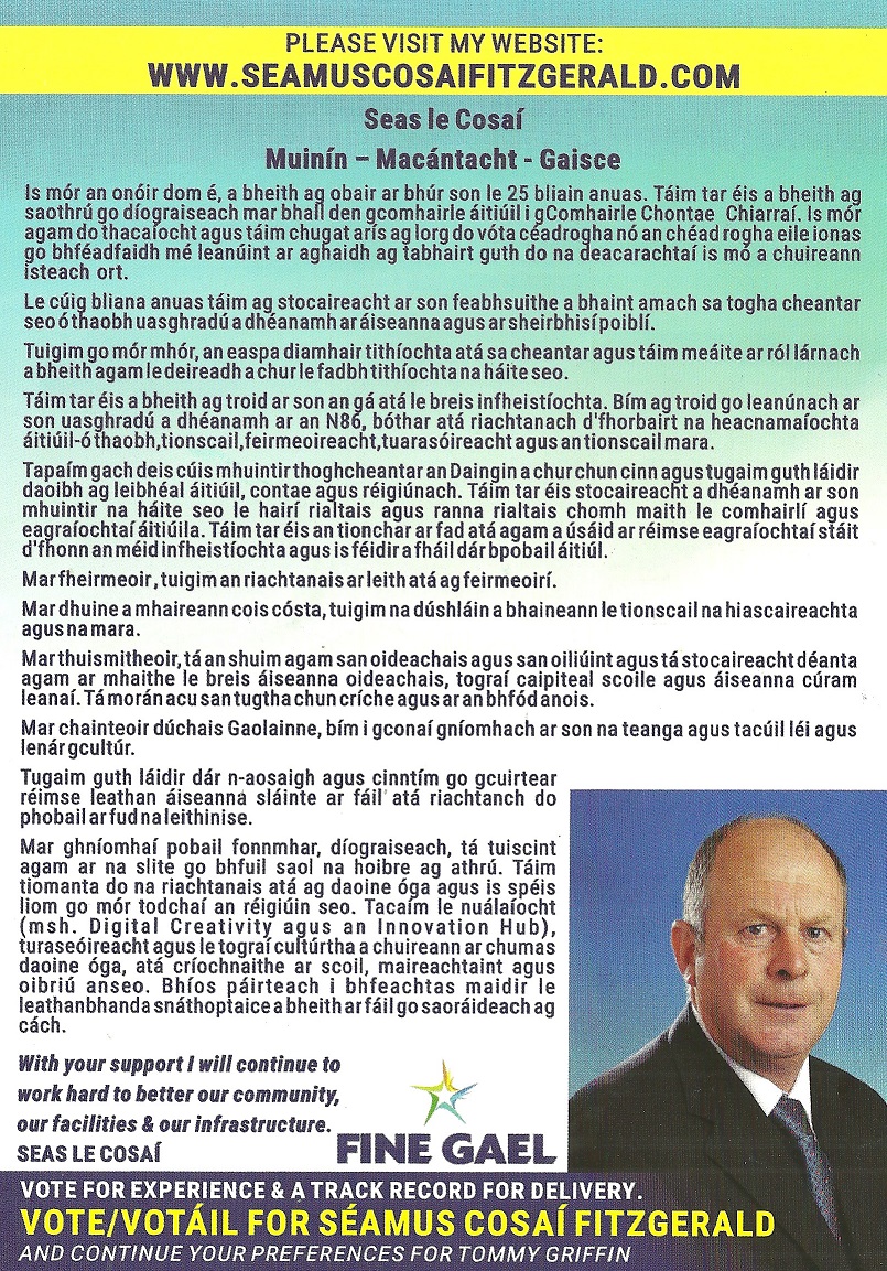 A Leaflet from Séamus Cosaí Fitzgerald who is running for Fine Gael in Dingle /An Daingean in the 2024 Local Elections