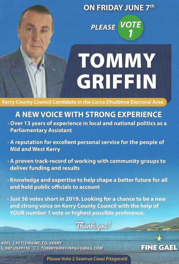 A leaflet from Tommy Griffin who is running for Fine Gael in Dingle / An Daingean in the 2024 Local Elections