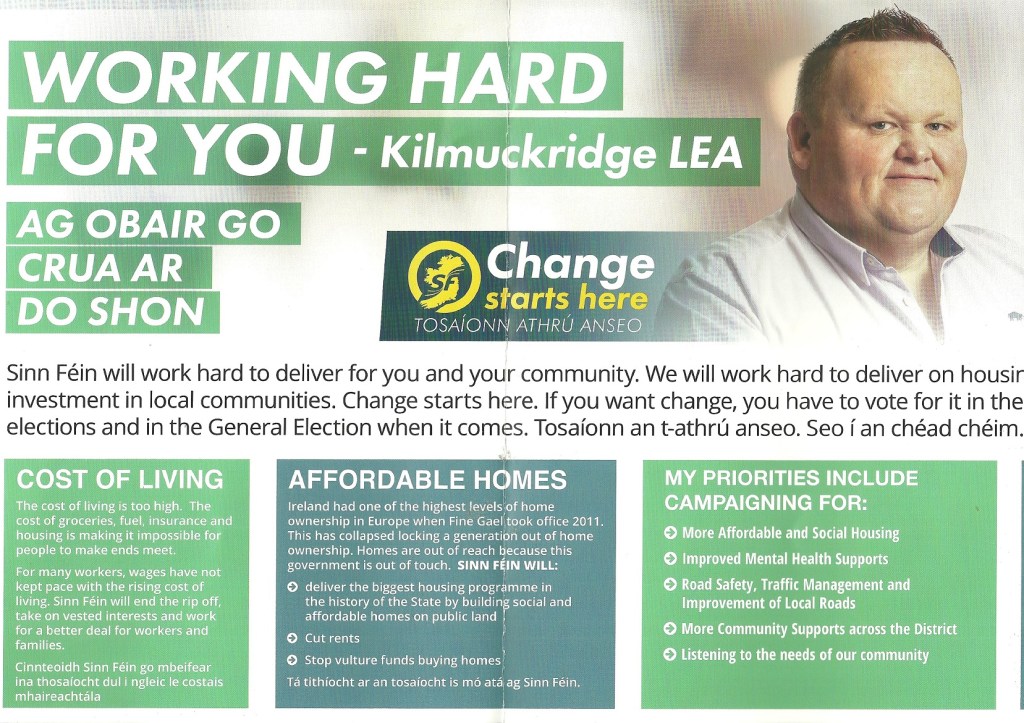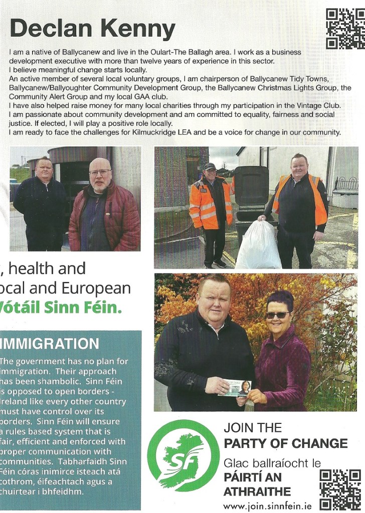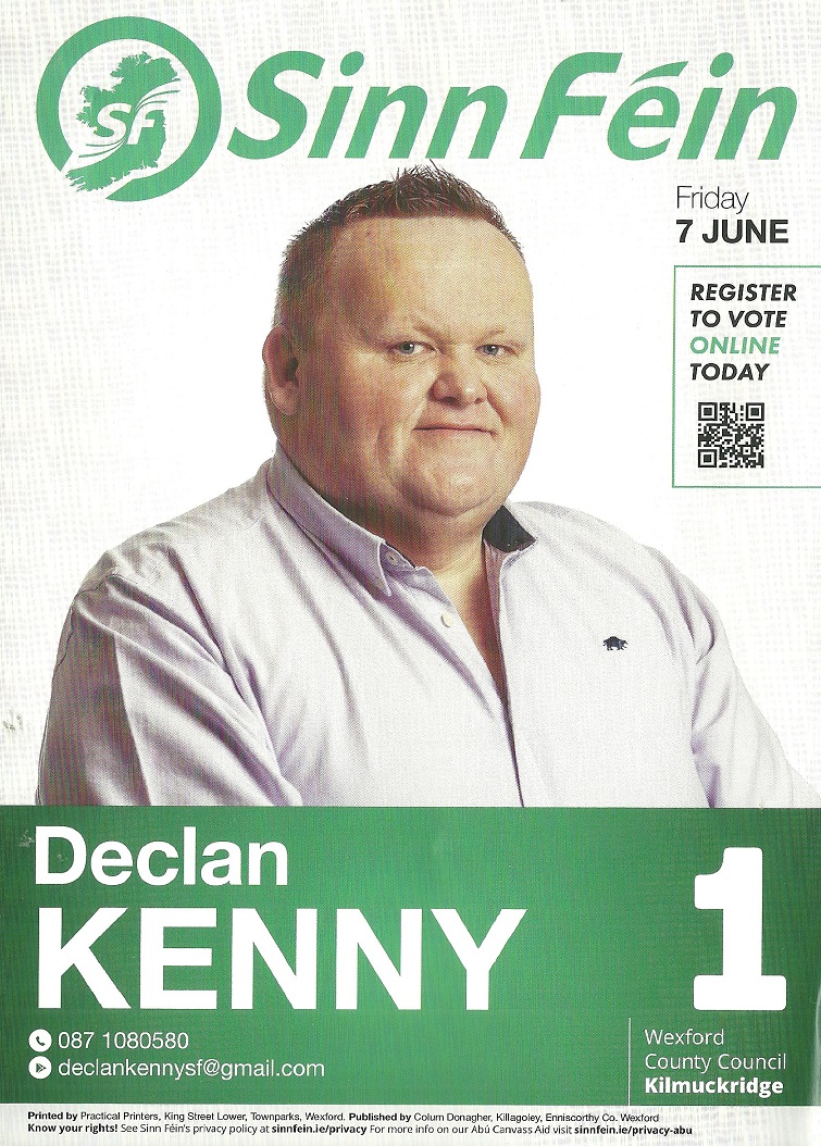 A leaflet from Declan Kenny who is running for Sinn Féin in Kilmuckridge in the 2024 Local Elections