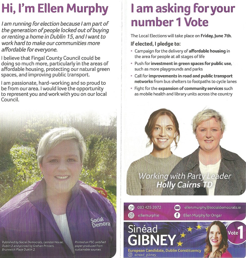 A leaflet from Ellen Murphy who is running for The Social Democrats in Ongar in the 2024 Local Elections