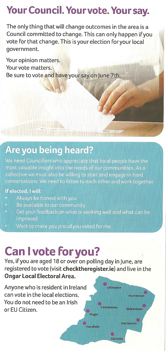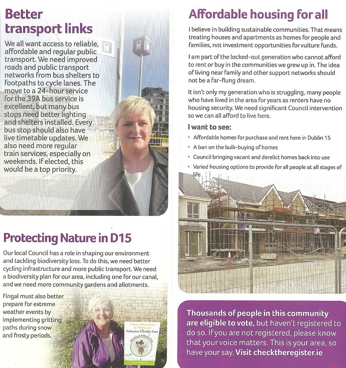 A leaflet from Ellen Murphy who is running for The Social Democrats in Ongar in the 2024 Local Elections