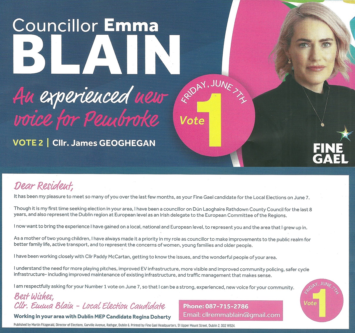 A leaflet form Emma Blain who is running for Fine Gael in Pembroke in the 2024 Local Elections
