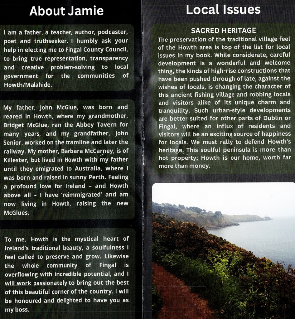 A leaflet from Jamie McGlue who is running as an Independent in Howth Malahide in the 2024 Local Elections