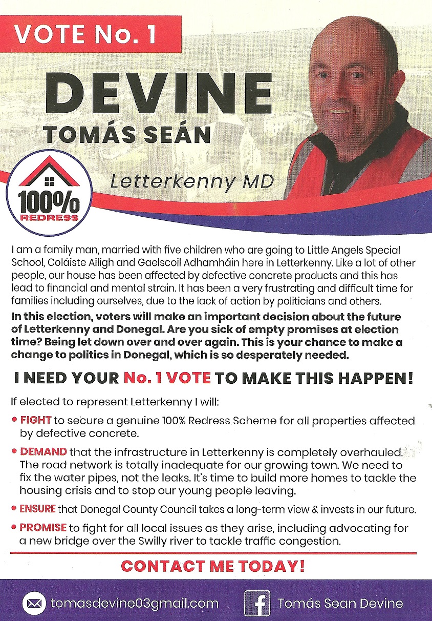 Leaflet from Tomás Seán Devine – 100% Redress Party – Letterkenny – 2024 Local Elections » tomasseandevinele24a
