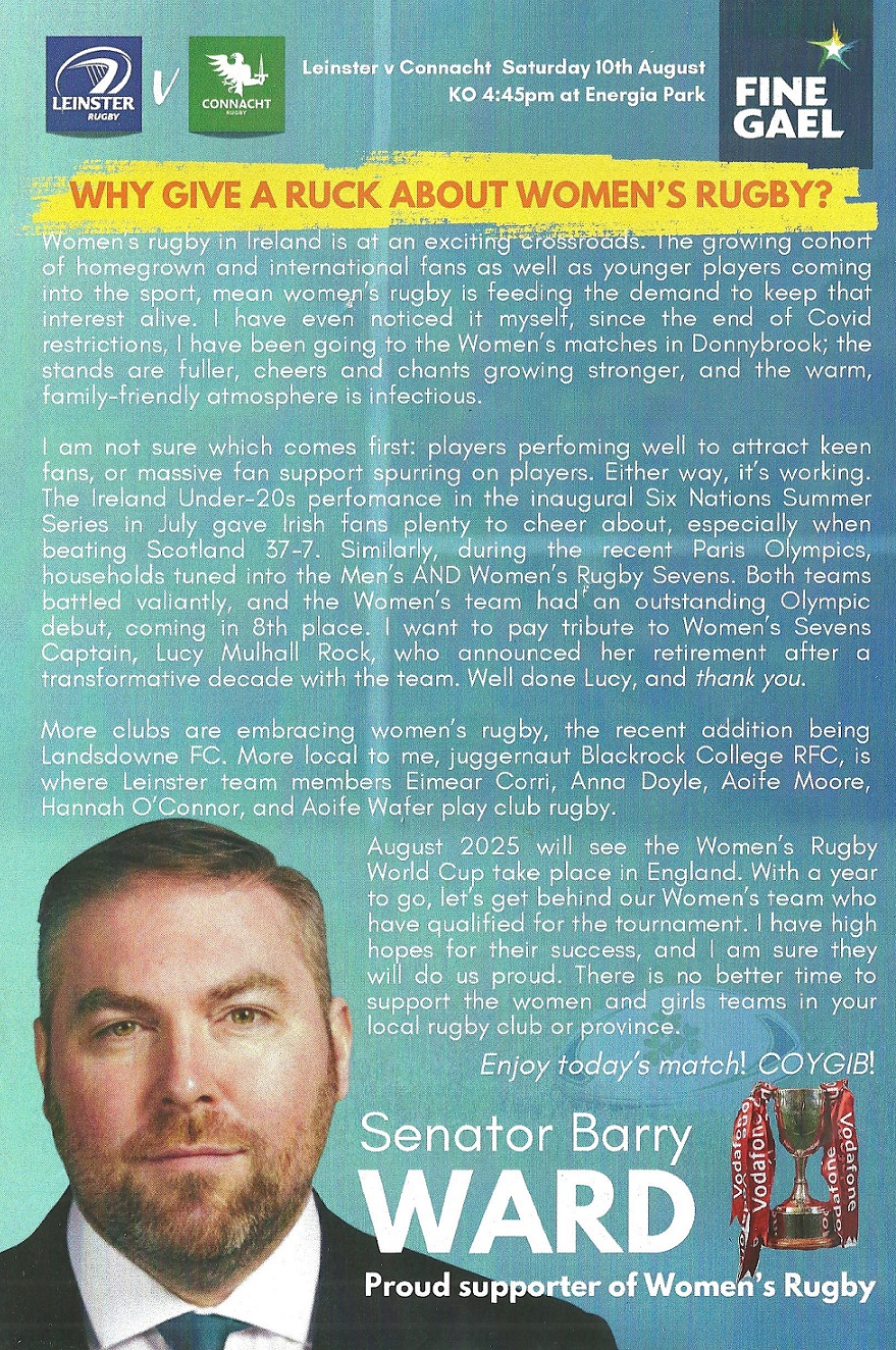 “Come on Leinster” – Women’s Rugby Leaflet from Senator Barry Ward -Fine Gael – Dún Laoghaire » BWardLeinsterb