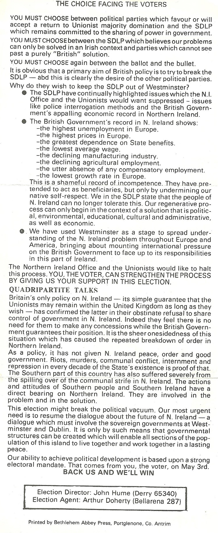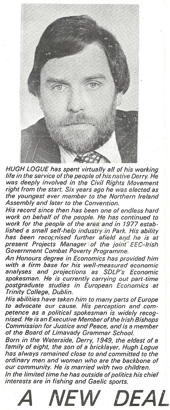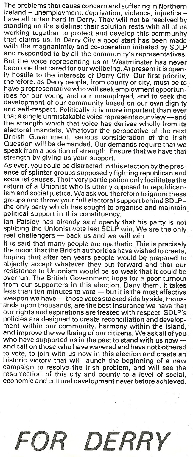 A leaflet from Hugh Logue who was running for the SDLP in Derry in the 1979 Westminster Election.