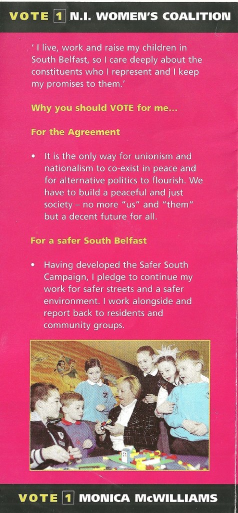 From the 2003 Assembly Elections a leaflet from Monica McWilliams who was running for The Northern Ireland Women’s Coalition in Belfast South.