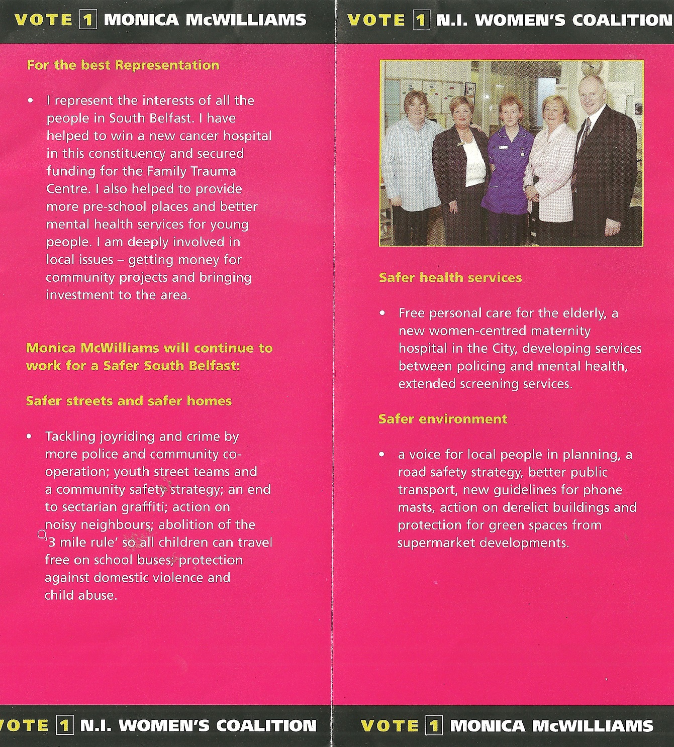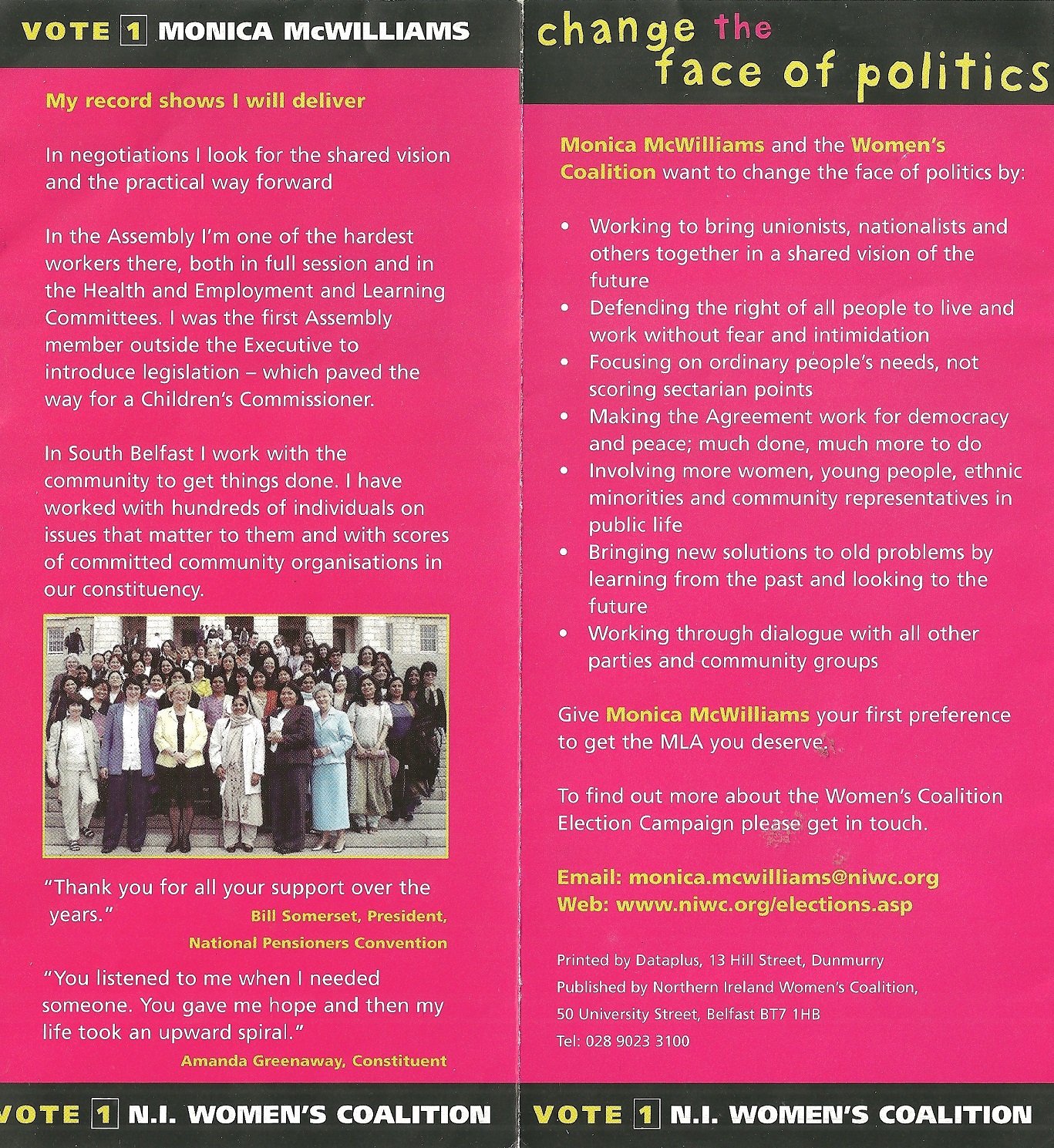 From the 2003 Assembly Elections a leaflet from Monica McWilliams who was running for The Northern Ireland Women’s Coalition in Belfast South.