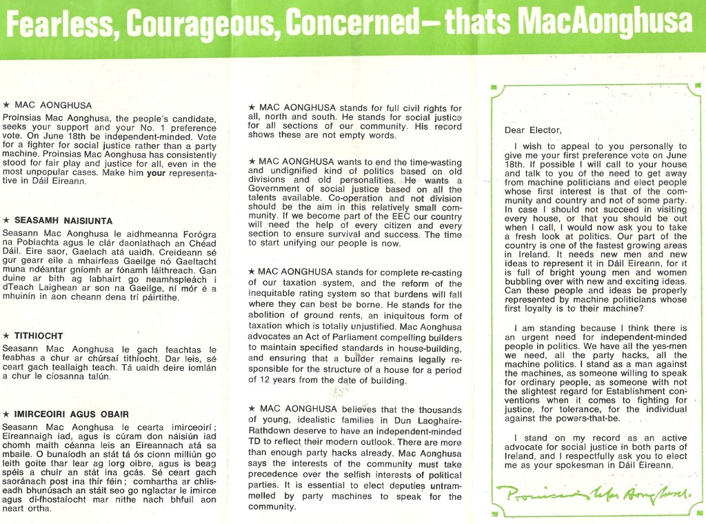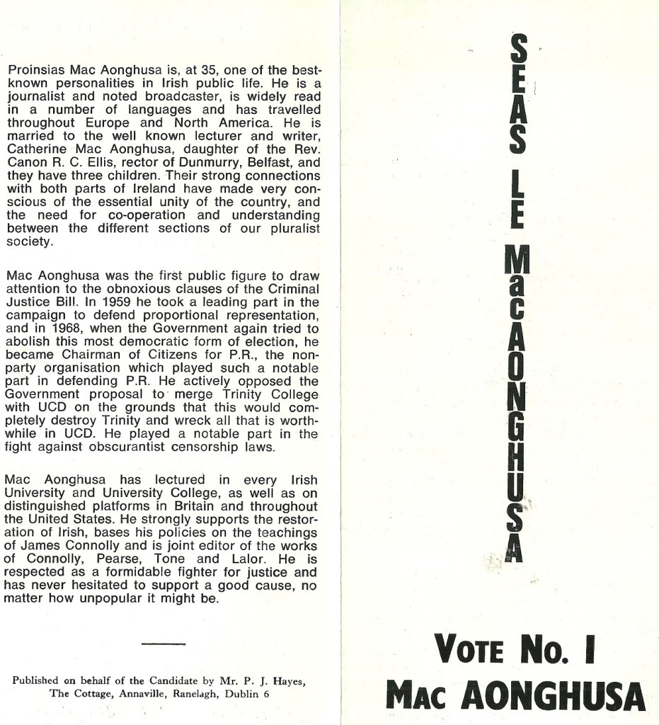A leaflet from Proinsias Mac Aonghusa who was running as an Independent in the 1969 General Election in Dún Laoghaire. He polled 1446 votes and missed out on a seat. His wiki page has some information about him. Many thanks to the sender