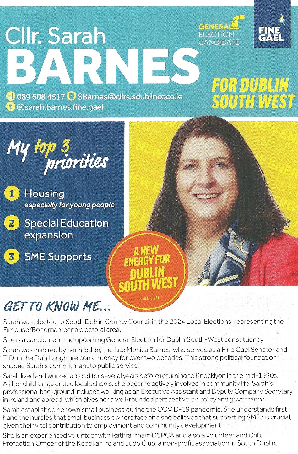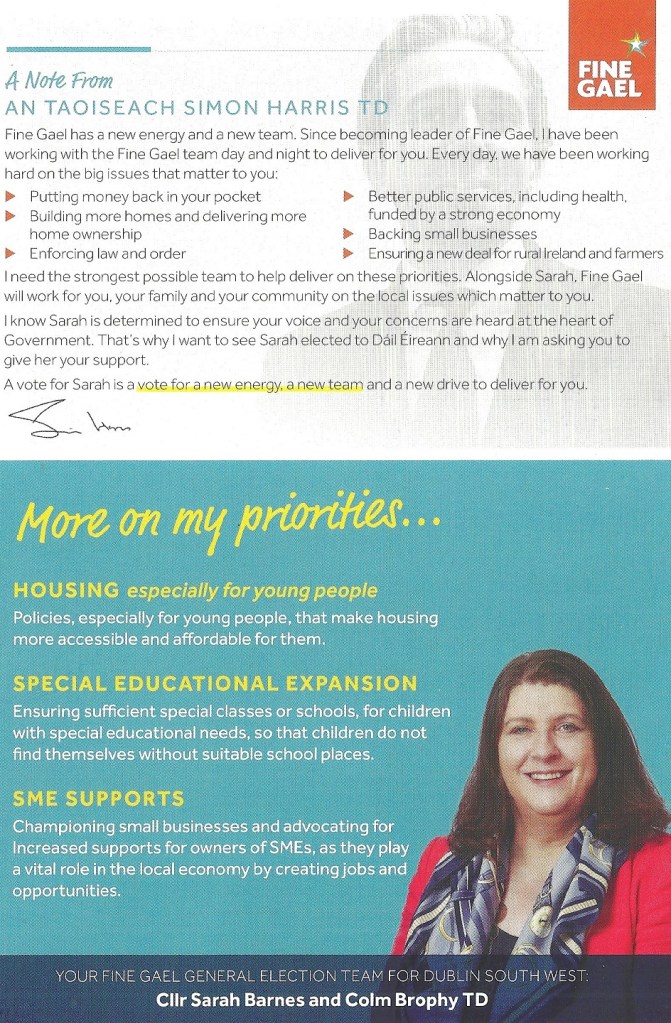 A leaflet from Cllr. Sarah Barnes who is running for Fine Gael in Dublin South West in the 2024 General Election.