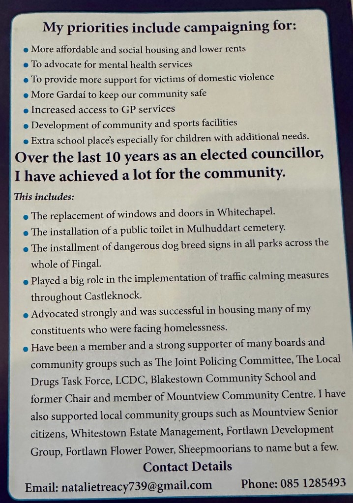 A leaflet from former Sinn Féin Councillor Natalie Treacy who is running as an Independent in Dublin West.