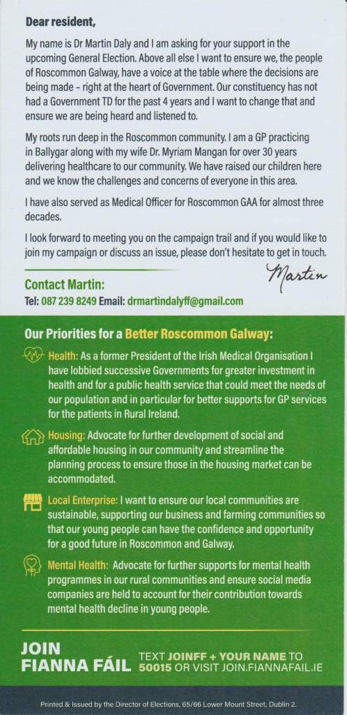A leaflet from Martin Daly who is running for Fianna Fáil in Roscommon Galway in the 2014 General Election.