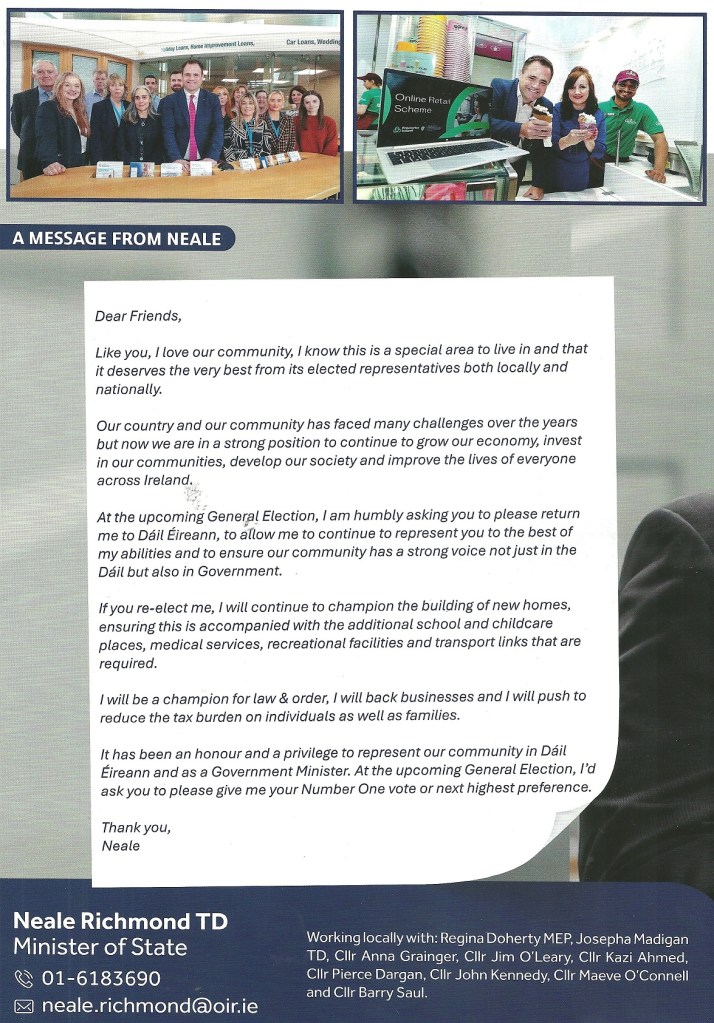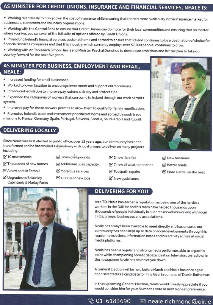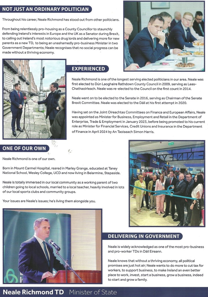 A leaflet from Neale Richmond who is running for Fine Gael in Dublin Rathdown in the 2024 General Election.