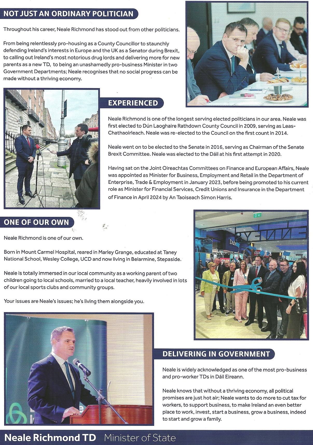 A leaflet from Neale Richmond who is running for Fine Gael in Dublin Rathdown in the 2024 General Election.