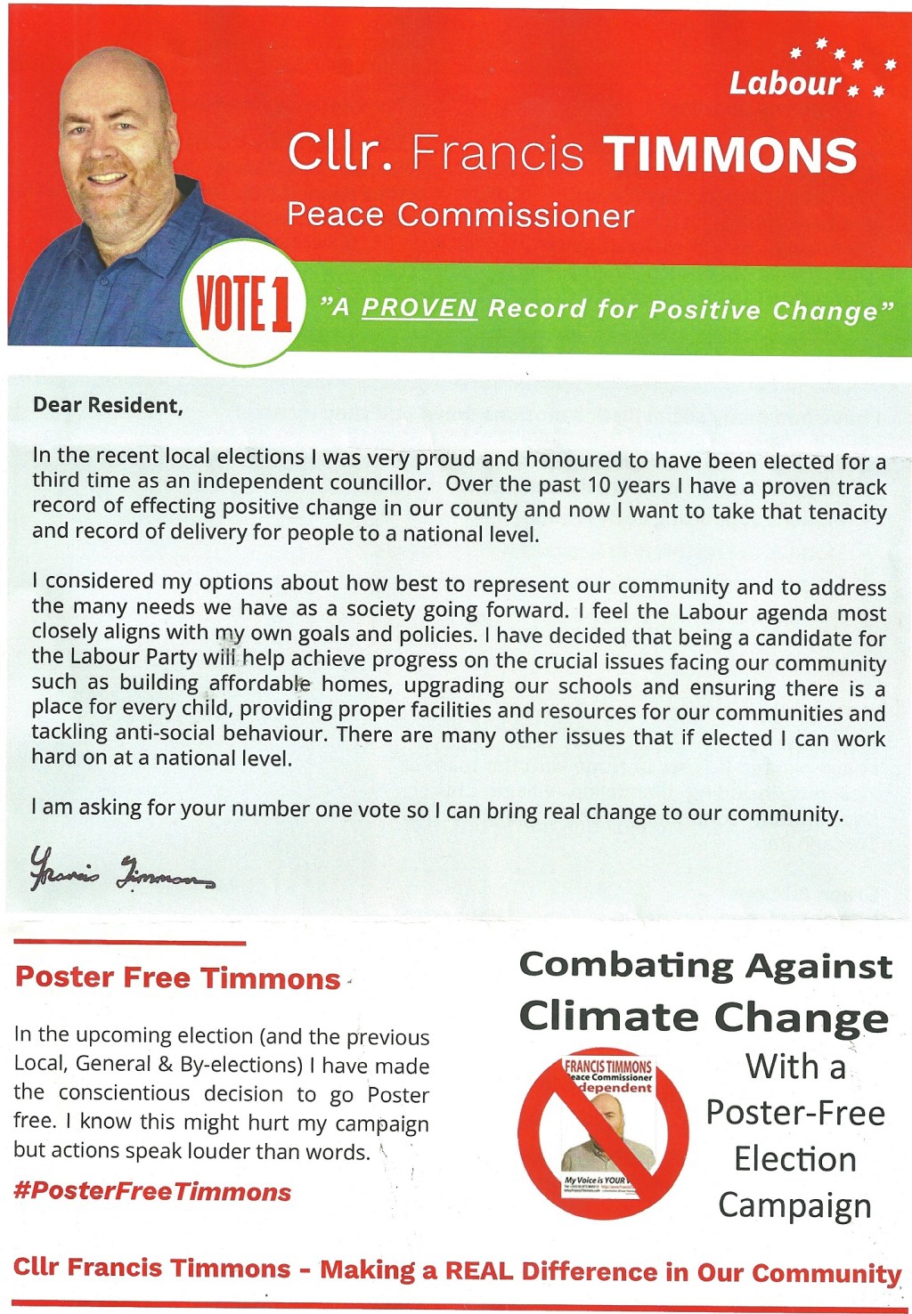 Leaflet from Francis Timmons – Labour – Dublin Mid West – 2024 General Election » FrancisTimmonsGE24a