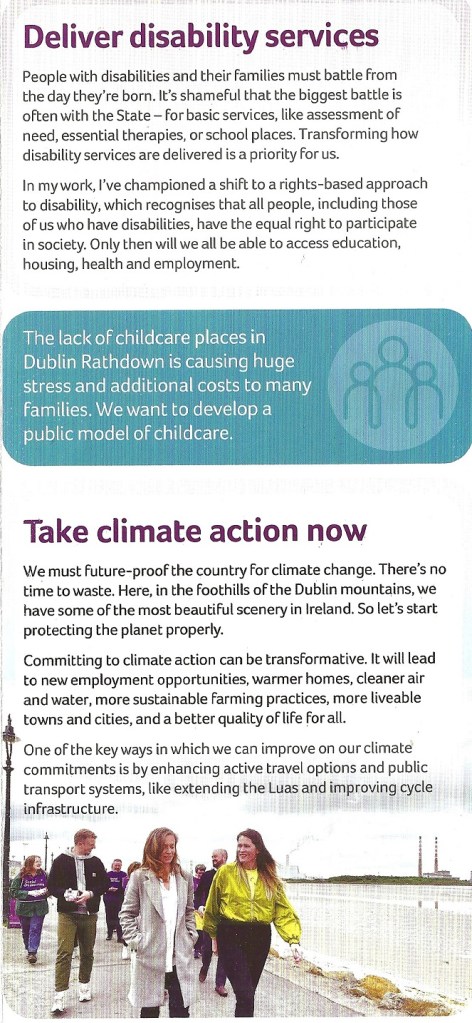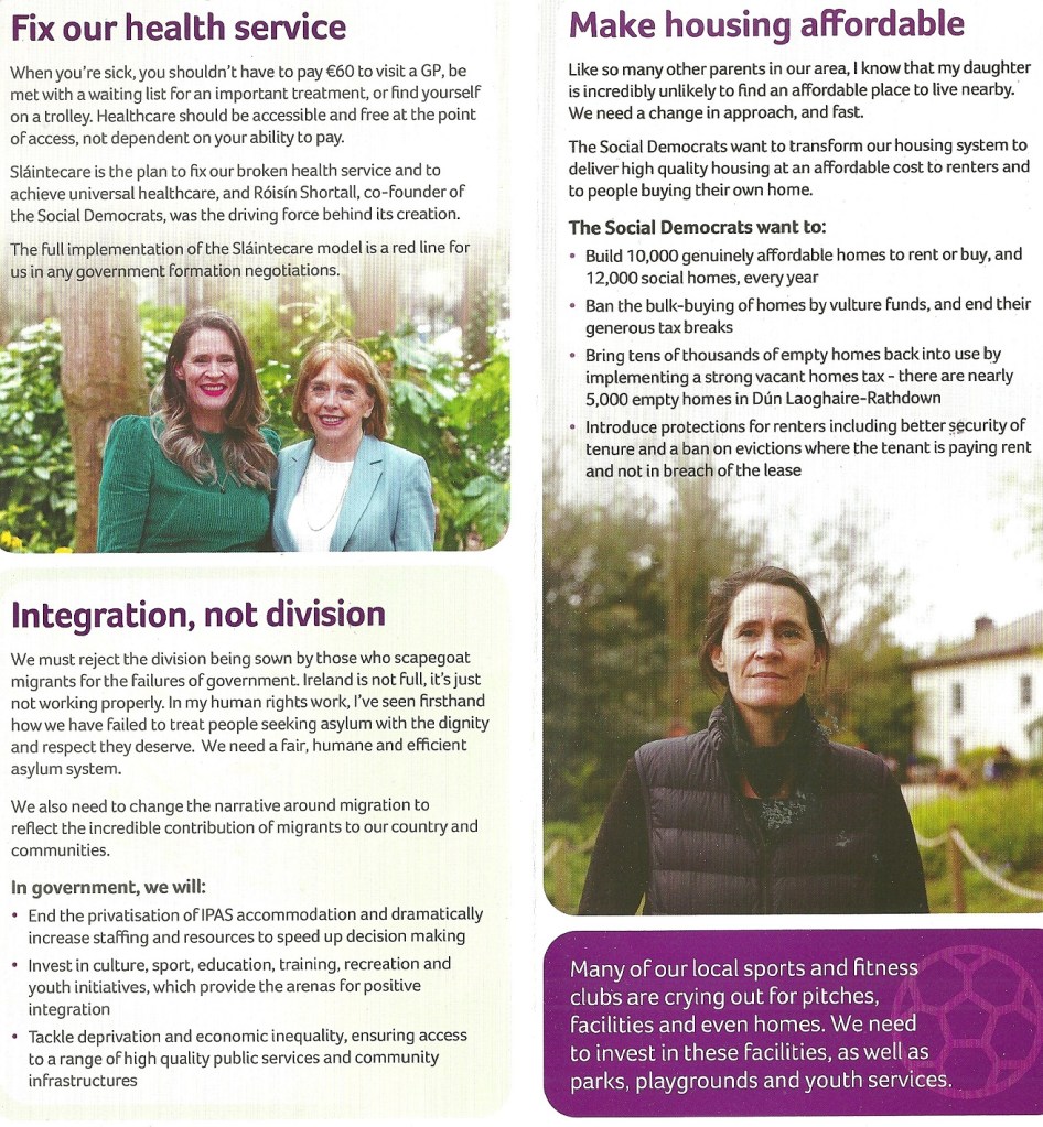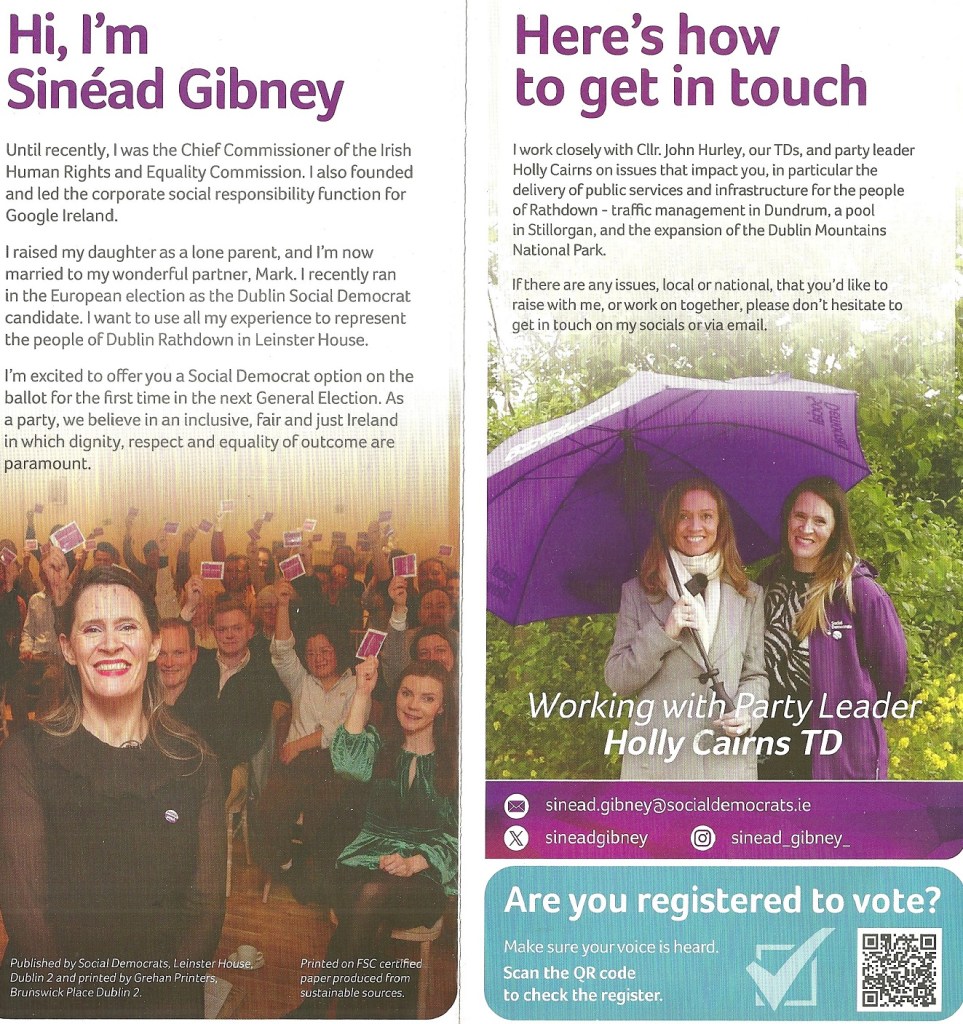 A leaflet from Sinéad Gibney who is running for The Social Democrats in Dublin Rathdown in the 2024 General Election.