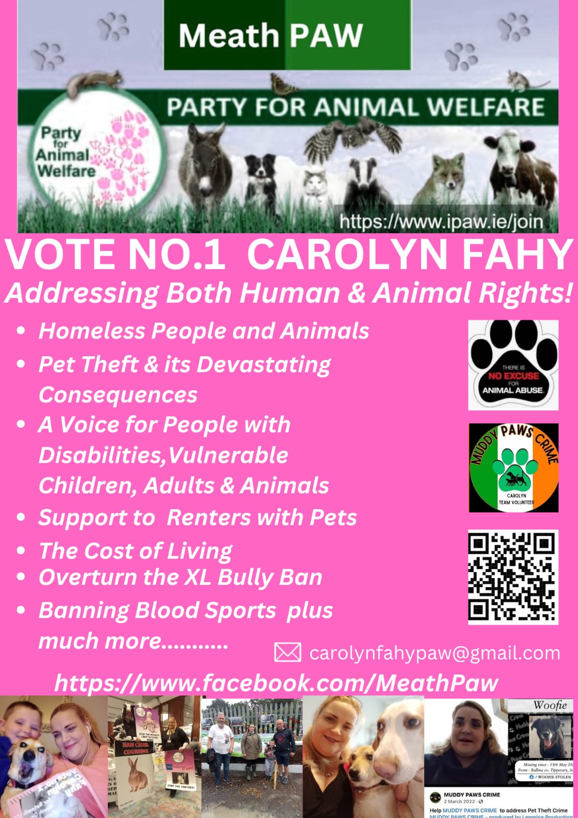 A leaflet from Carolyn Fahy who is running for The Party for Animal Welfare (PAW) in Meath East in the 2024 General Election