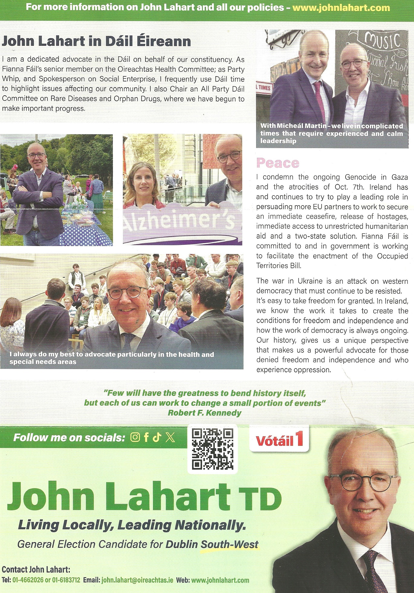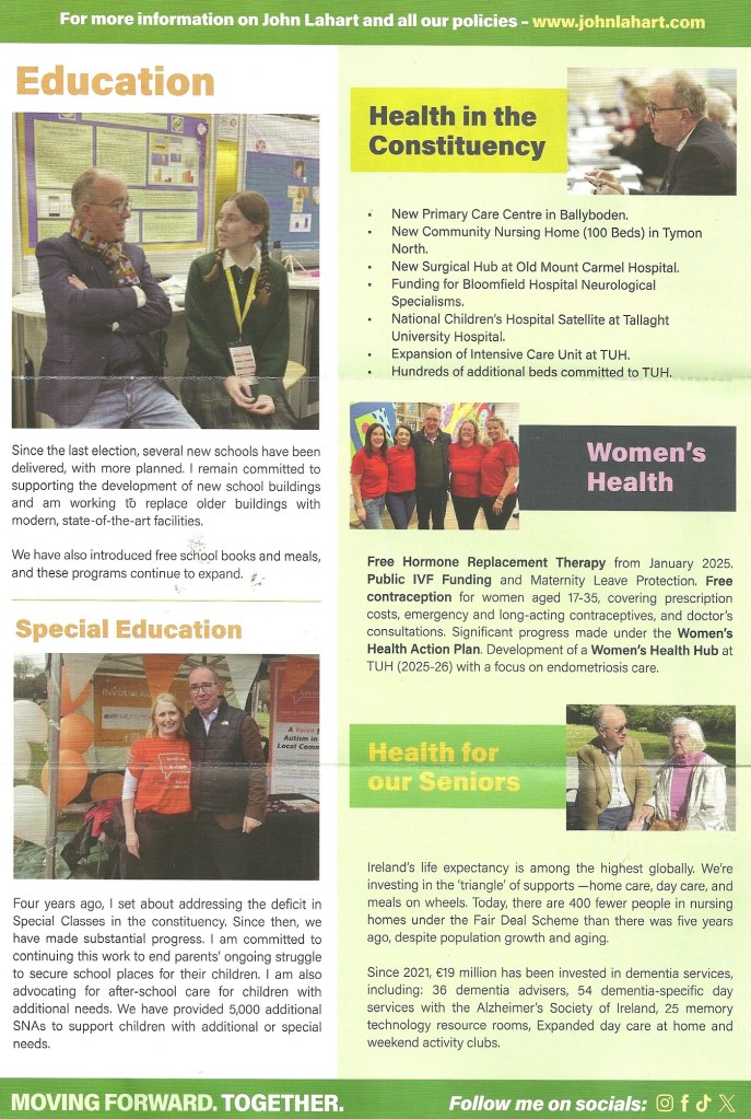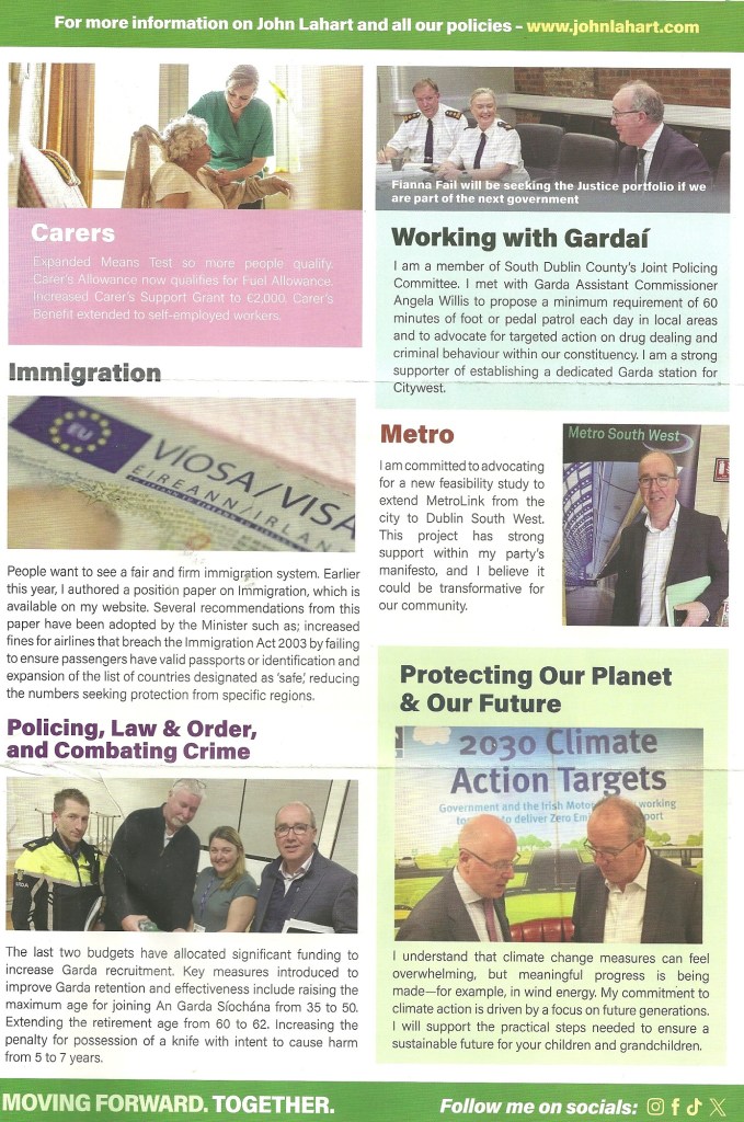 A leaflet from John Lahart who is running for Fianna Fáil in Dublin South West in the 2024 General Election.