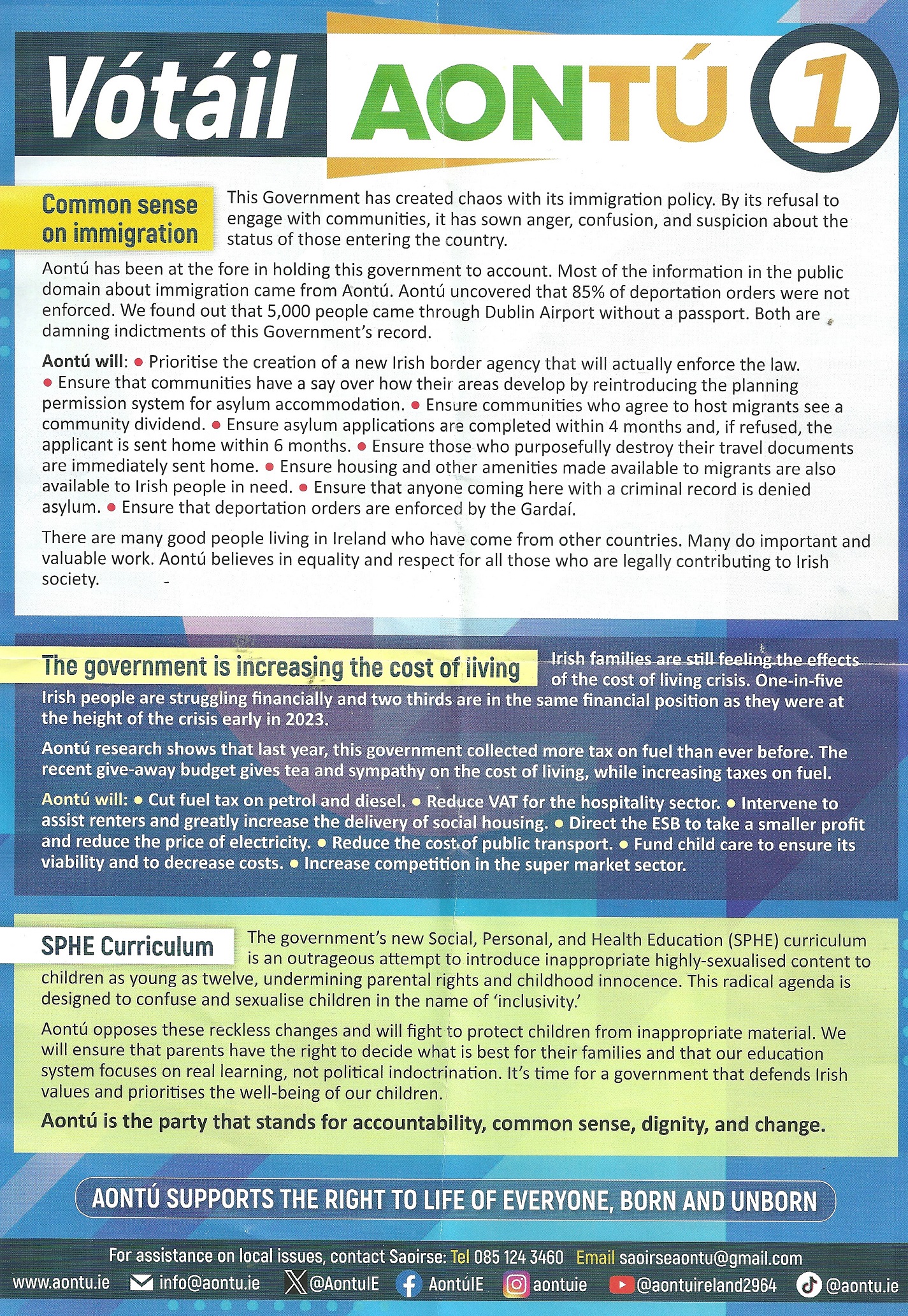 A Leaflet from Saoirse Ní Chonárain who is running for Aontú in Dublin South West in the 2024 General Election.