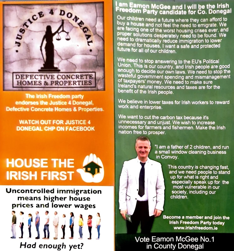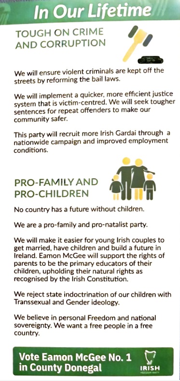 A Leaflet from Eamon McGee who is running for The Irish Freedom Party in Donegal in The 2024 General Election