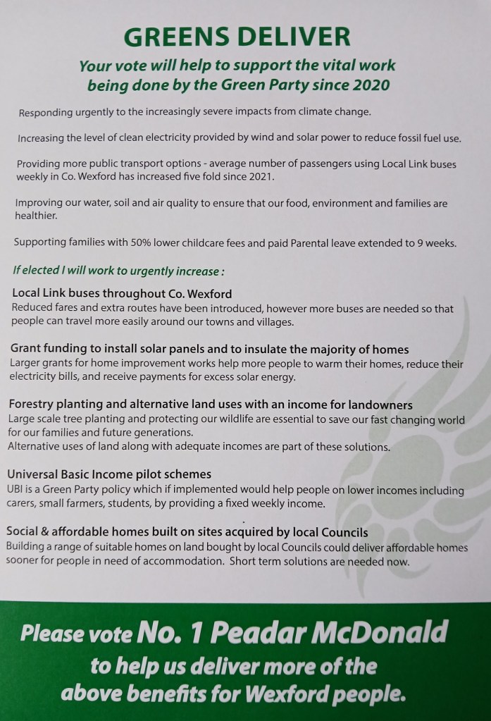 A Leaflet from Peadar McDonald running for The Green Party in Wexford in the 2024 General Election