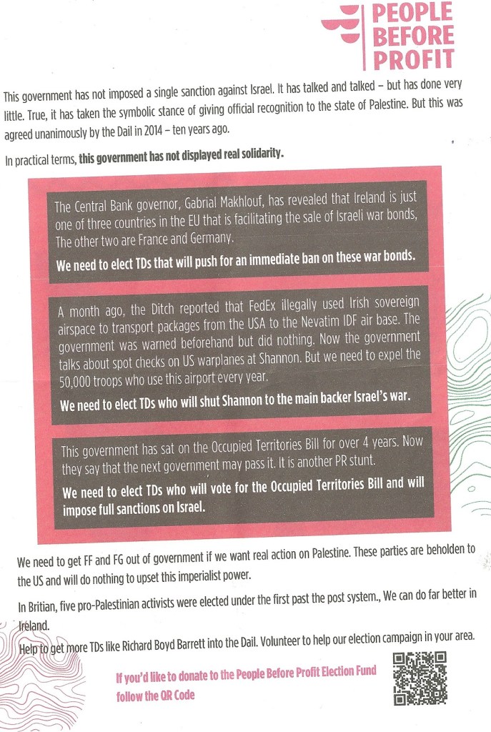 A “Make Palestine and Election Issue” leaflet from People Before Profit for The 2024 General Election