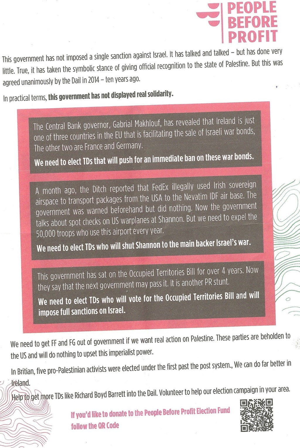 “Make Palestine and Election Issue” leaflet from People Before Profit – 2024 General Election » PBPPalestineGE24b