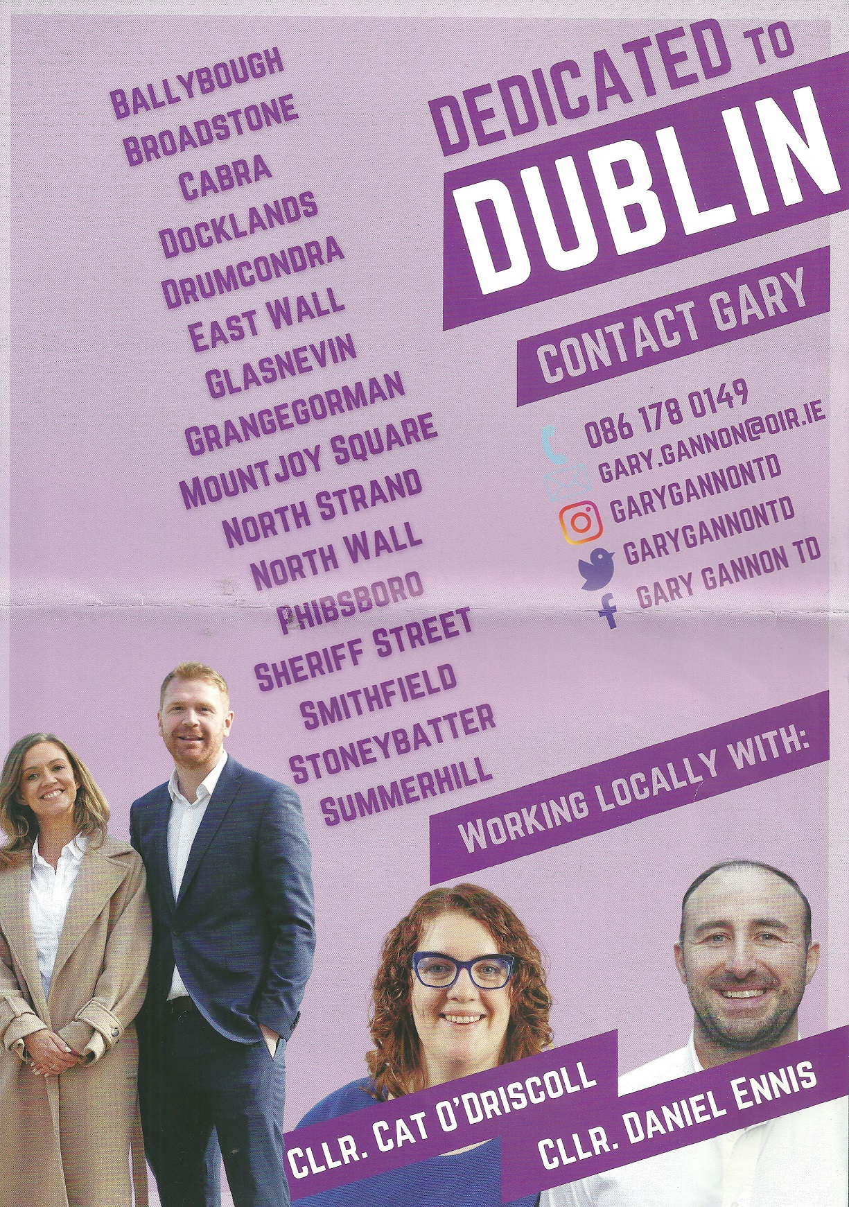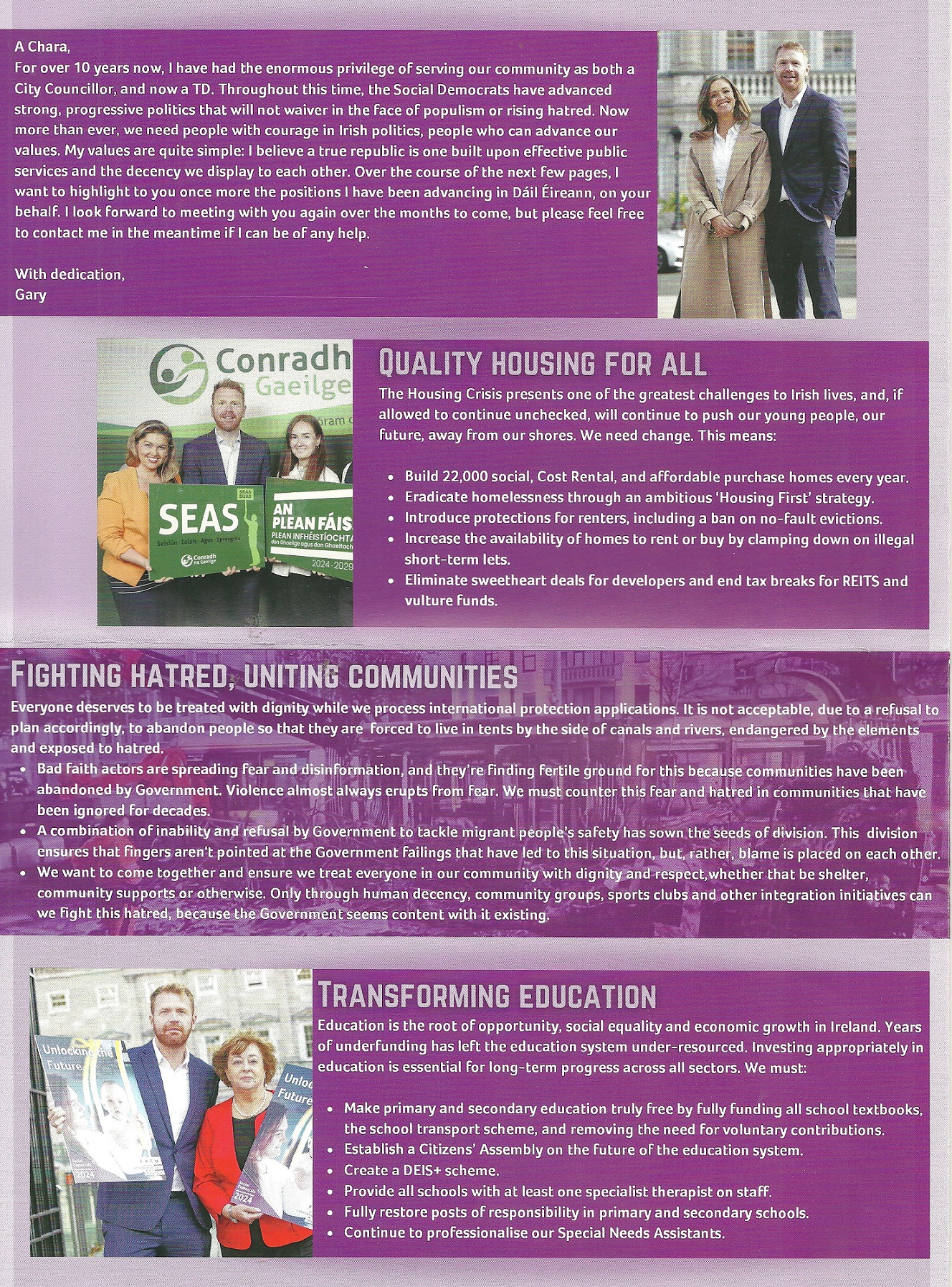 A Leaflet from Gary Gannon who is running for The Social Democrats in Dublin Central in the 2024 General Election