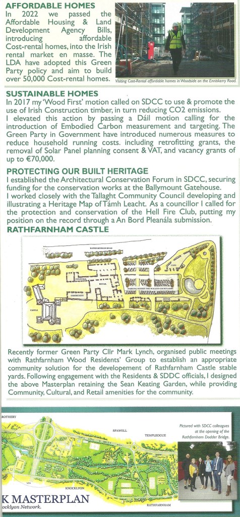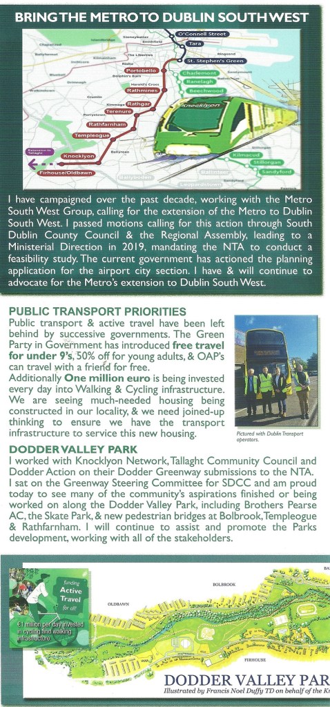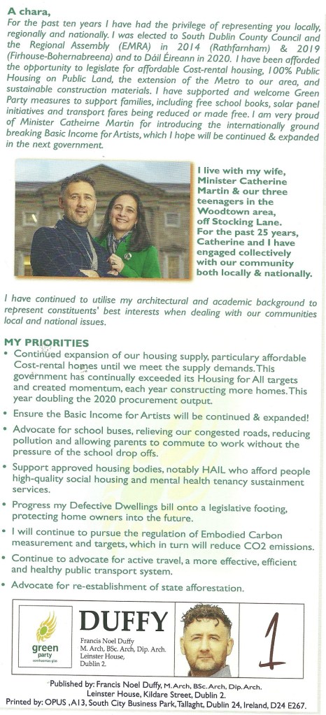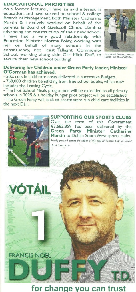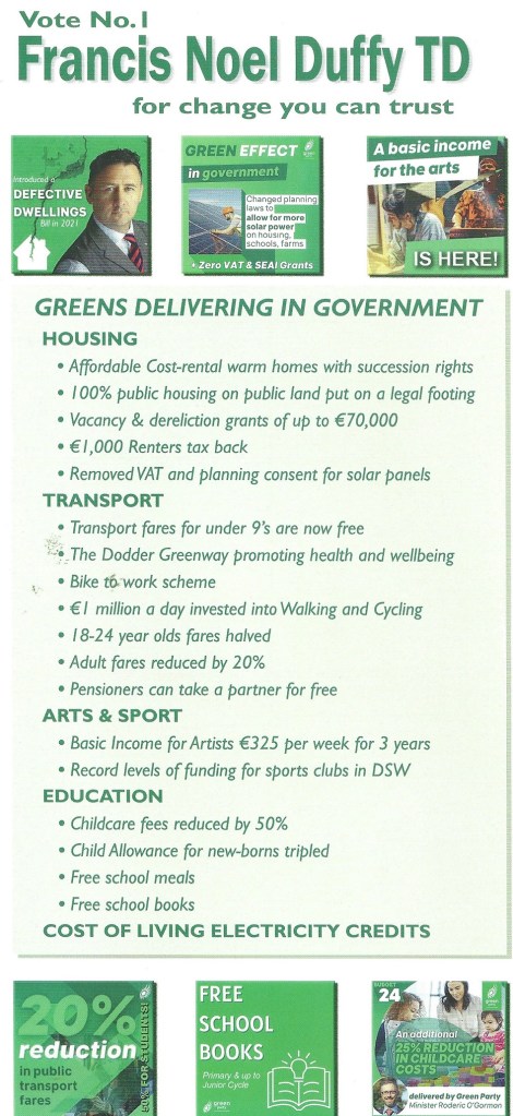 A Leaflet from Francis Noel Duffy who is running for The Green Party in Dublin South West in the 2024 General Election