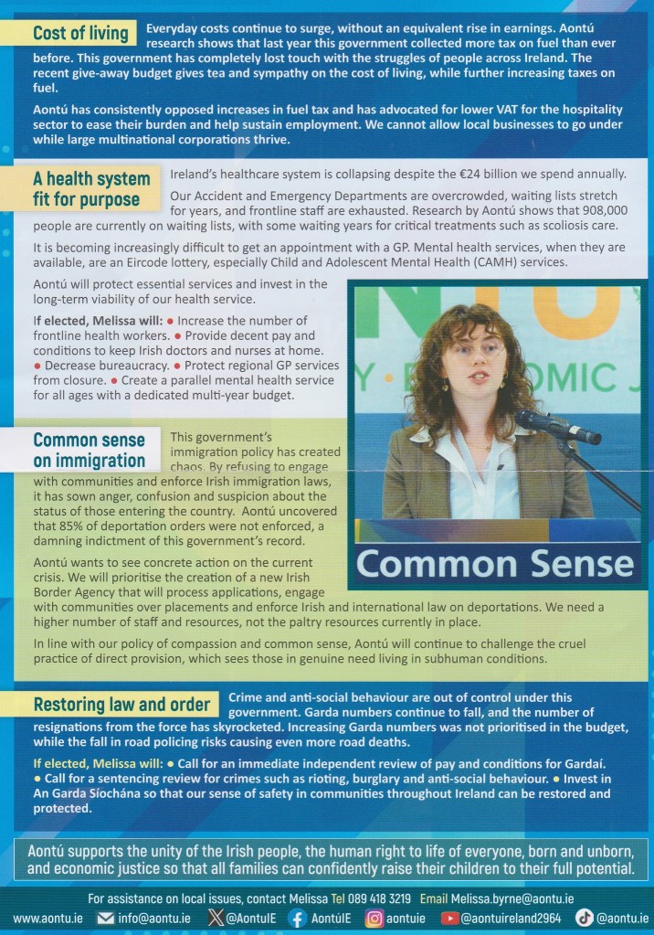 A leaflet from Melissa Byrne who is running for Aontú in Kildare South in the 2024 General Election
