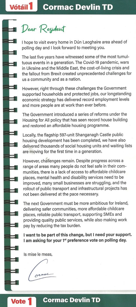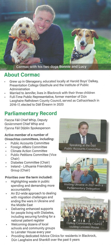 A Leaflet from Cormac Devlin who is running for Fianna Fáil in Dún Laoghaire in the 2024 General Election