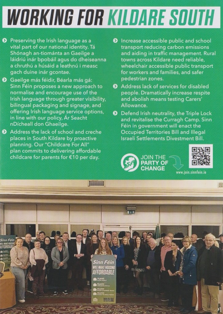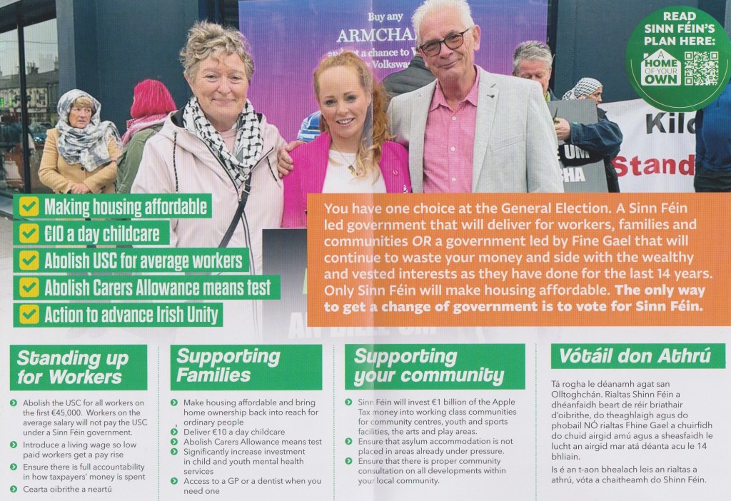 A leaflet from Shónagh Ní Raghallaigh who is running for Sinn Féin in Kildare South in the 2024 General Election