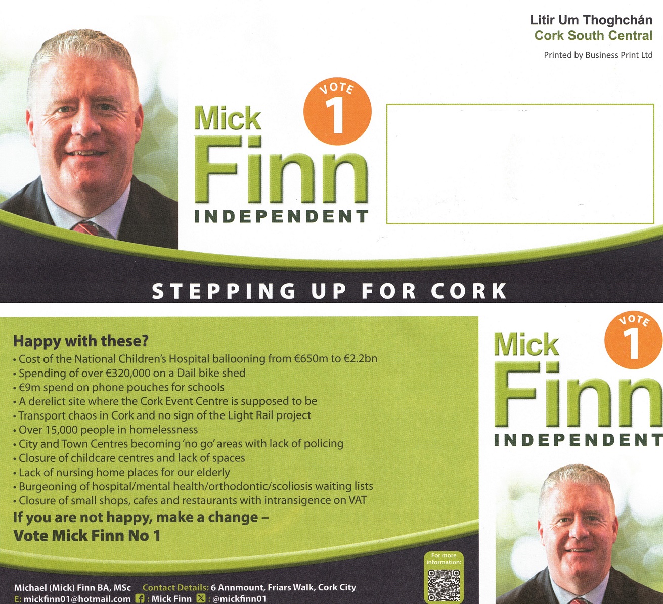 A leaflet from Mick Finn who is running as an Independent in Cork South Central in the 2024 General Election