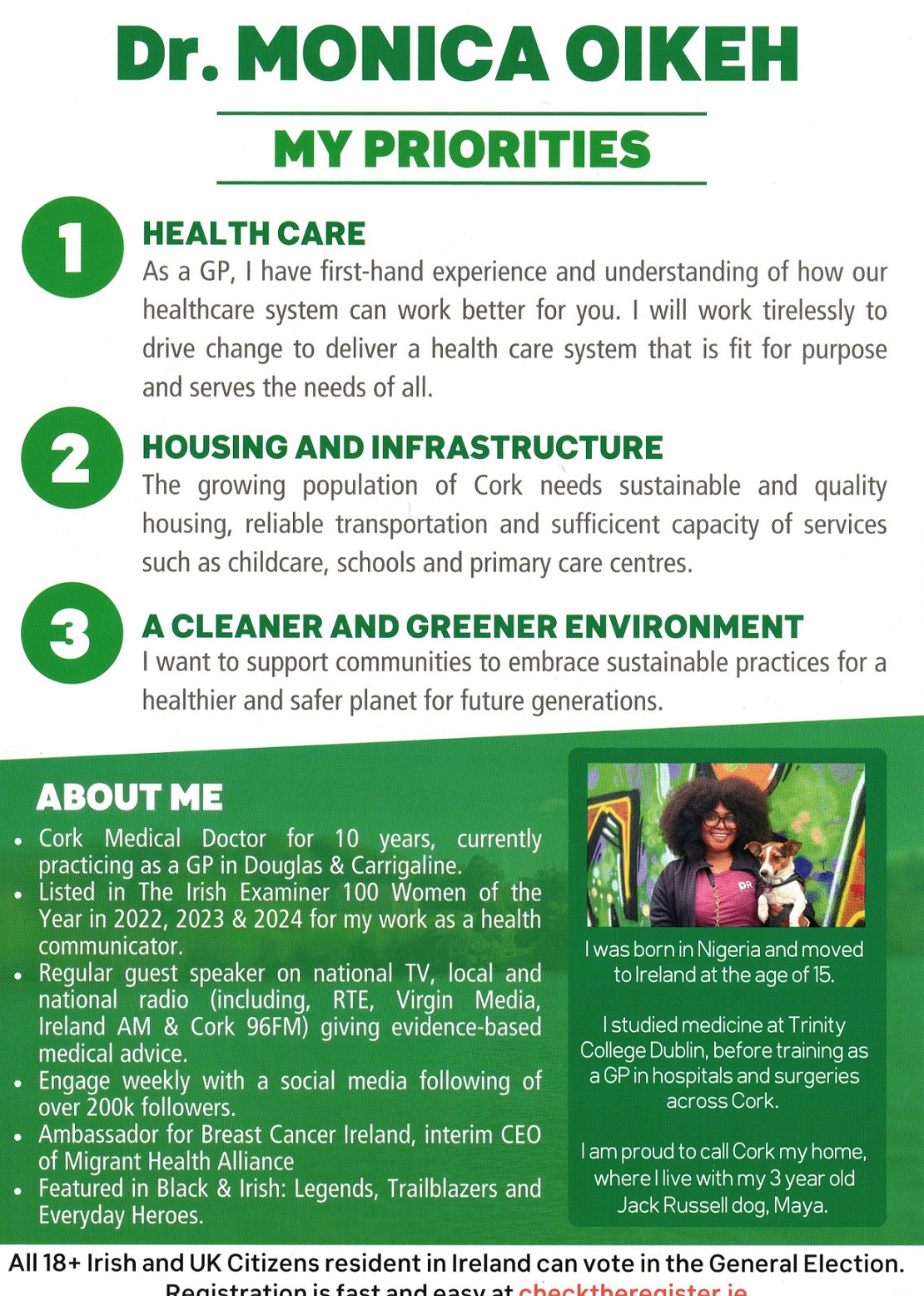 A Leaflet from Dr. Monica Oikeh who is running for The Green Party in Cork South Central in the 2024 General Election