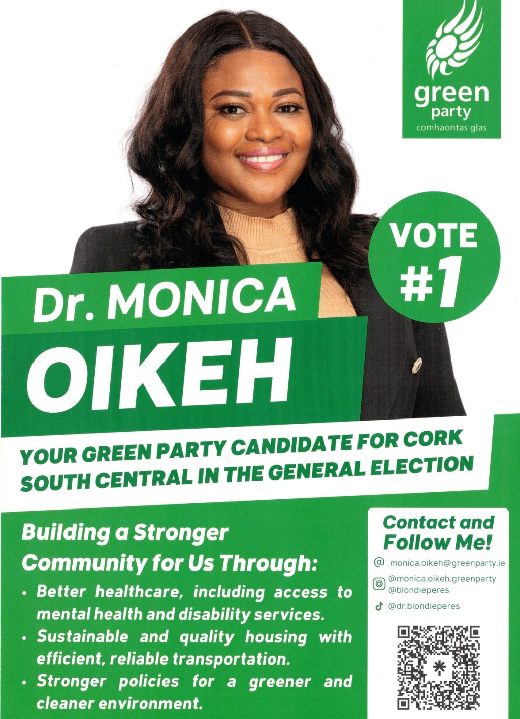 Leaflet from Monica Oikeh – Green Party – Cork South Central – 2024 General Election » MonicaOikehGE24a