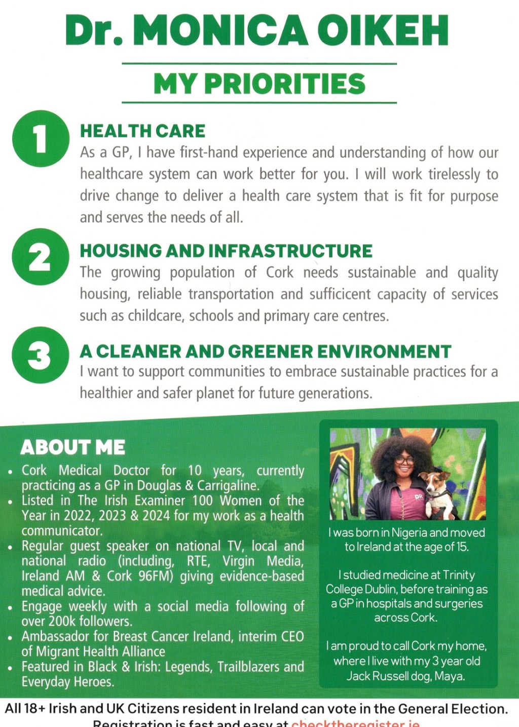 Leaflet from Monica Oikeh – Green Party – Cork South Central – 2024 General Election » MonicaOikehGE24b