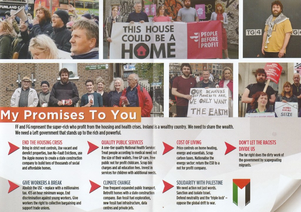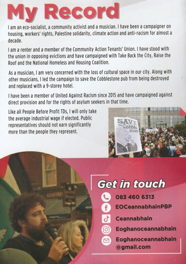 A Leaflet from Eoghan Ó Ceannabháin who is running for People Before Profit in Dublin Central in the 2024 General Election
