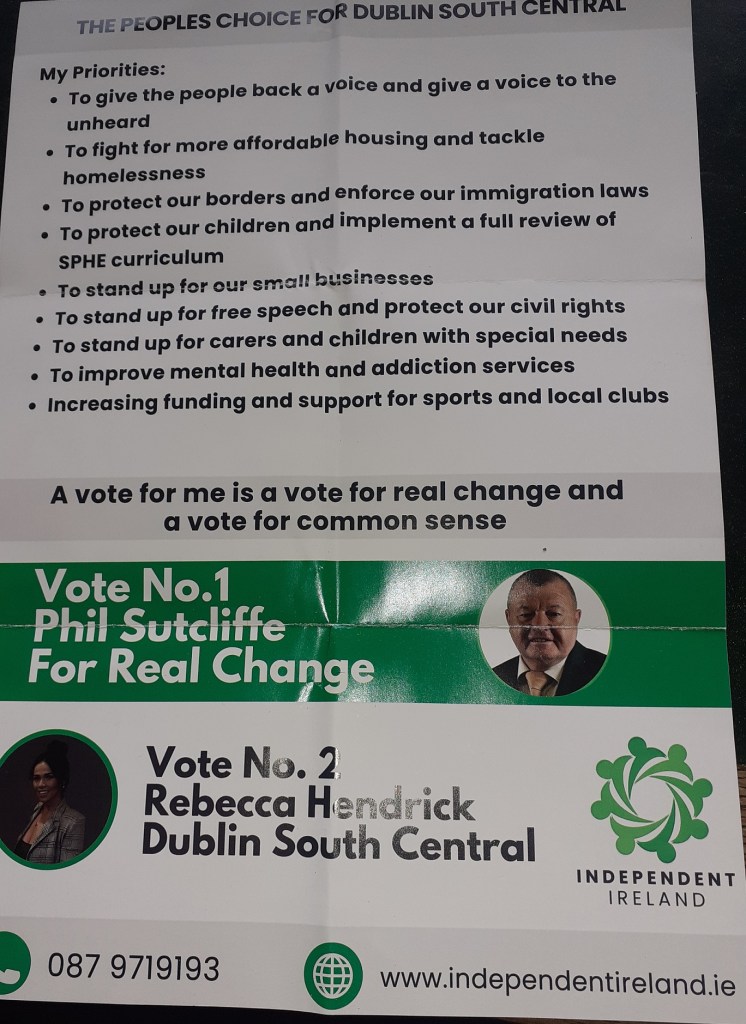 A Leaflet from Philip Sutcliffe who is running for Independent Ireland in Dublin South Central in the 2024 General Election