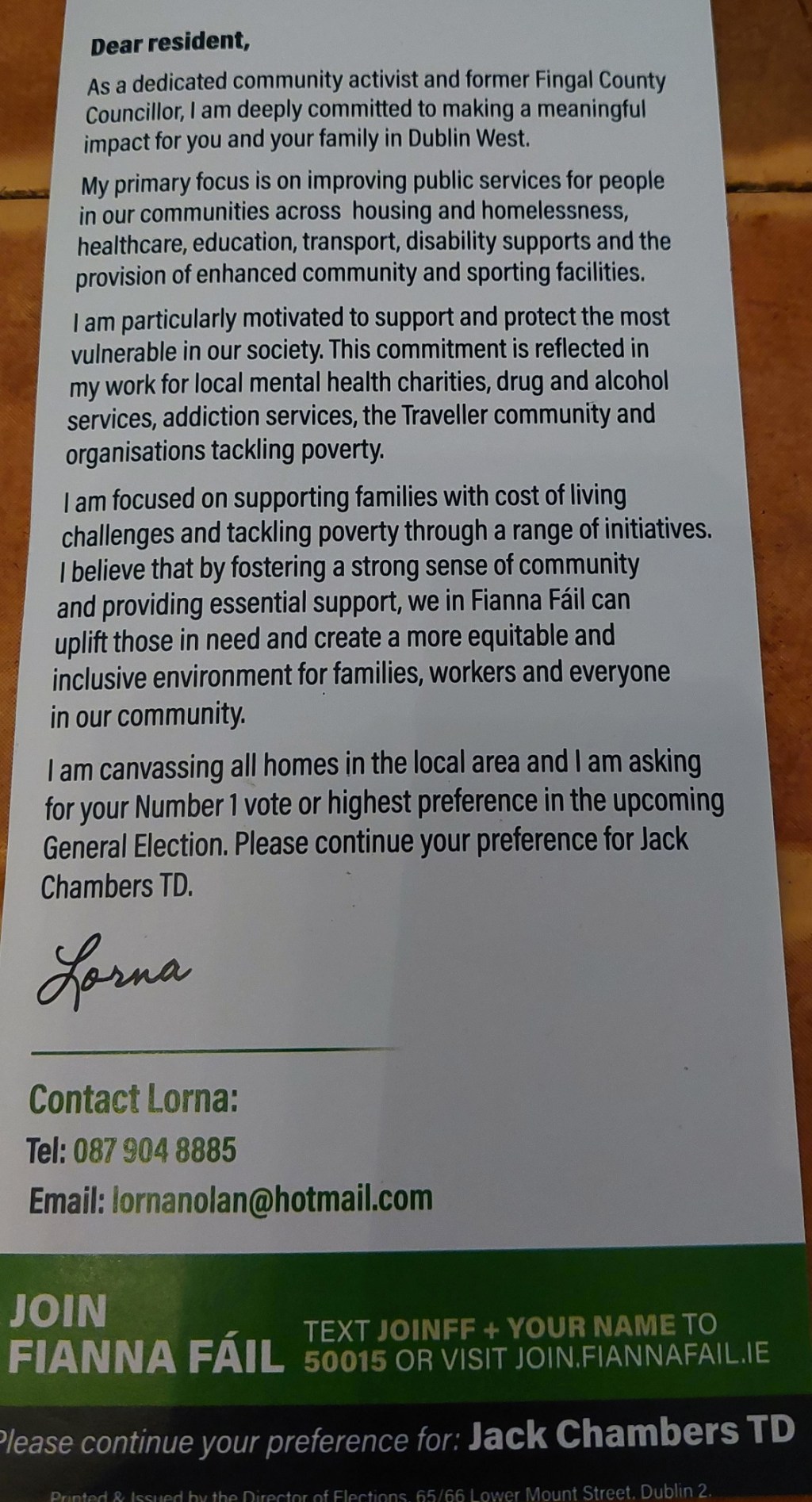 Leaflet from Lorna Nolan – Fianna Fáil – Dublin West – 2024 General Election » LornaNolanGE24b