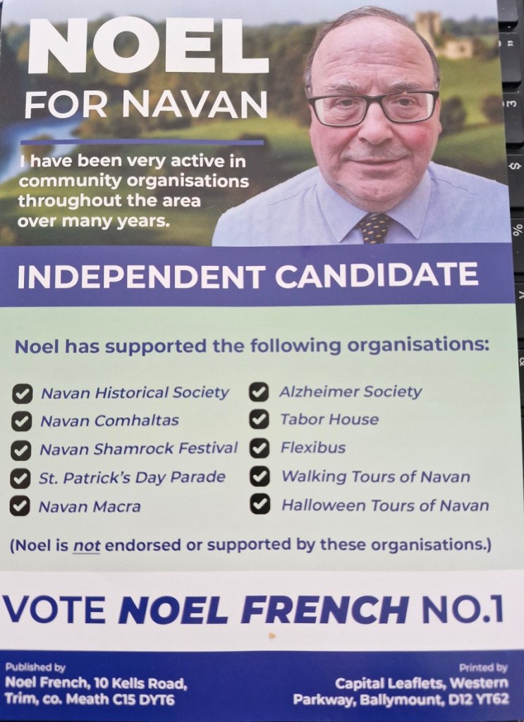 A Leaflet from Noel French who is running as an Independent in Meath West in the 2024 General Election